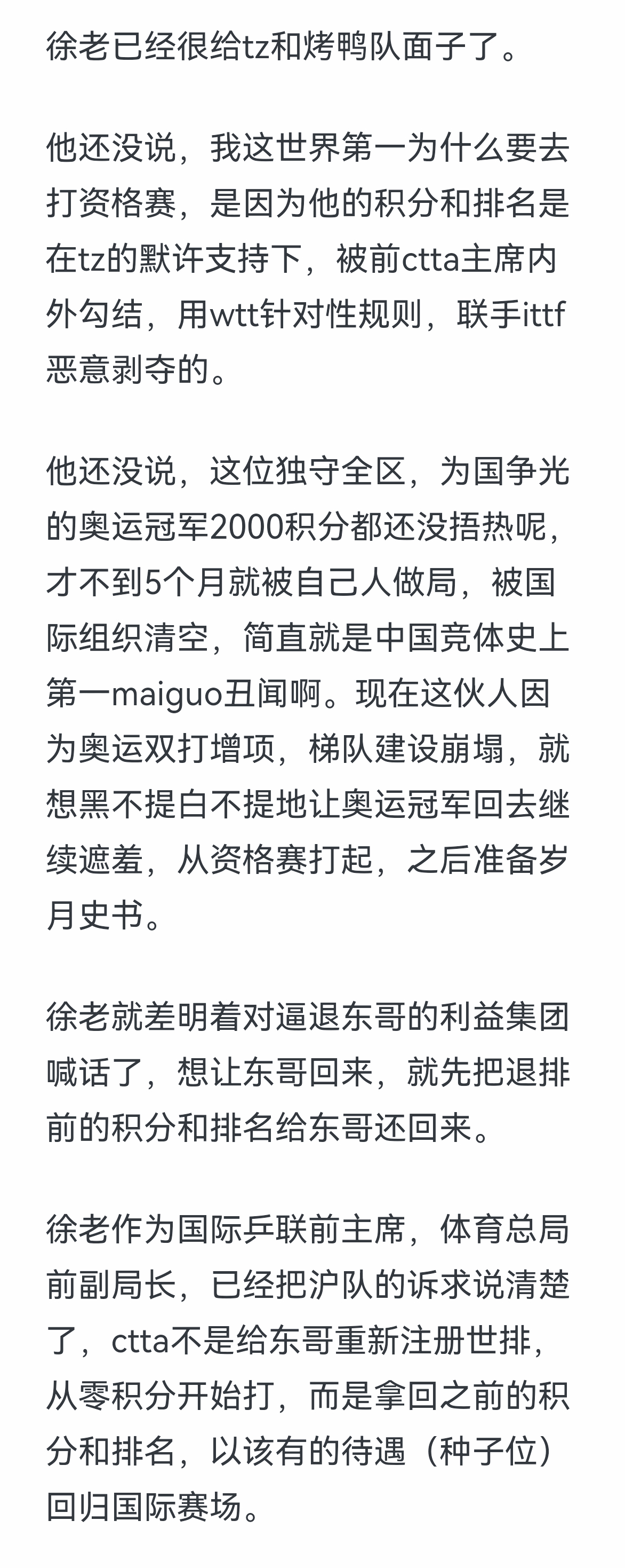 徐寅生谈乒乓球现状 关于徐寅生直播炮轰WTT和国际乒联的解读一位真正的权威发声了。徐寅生——执掌中国乒协31年、领导国际乒联4年且为终身名誉主席的传奇大佬,以其无可质疑的资历和官方背景,为这场争议定了调子:你WTT无权决定我们的世界第一是否出战!乒坛泰斗谈奥运会参赛资格