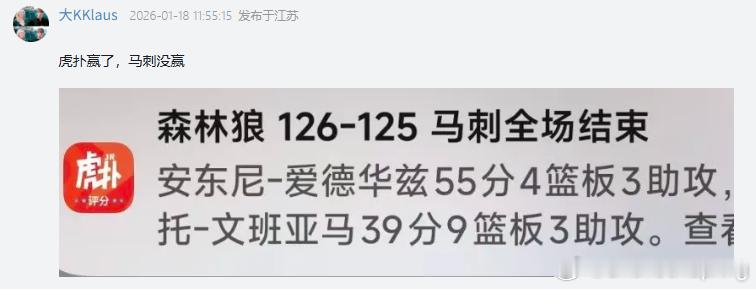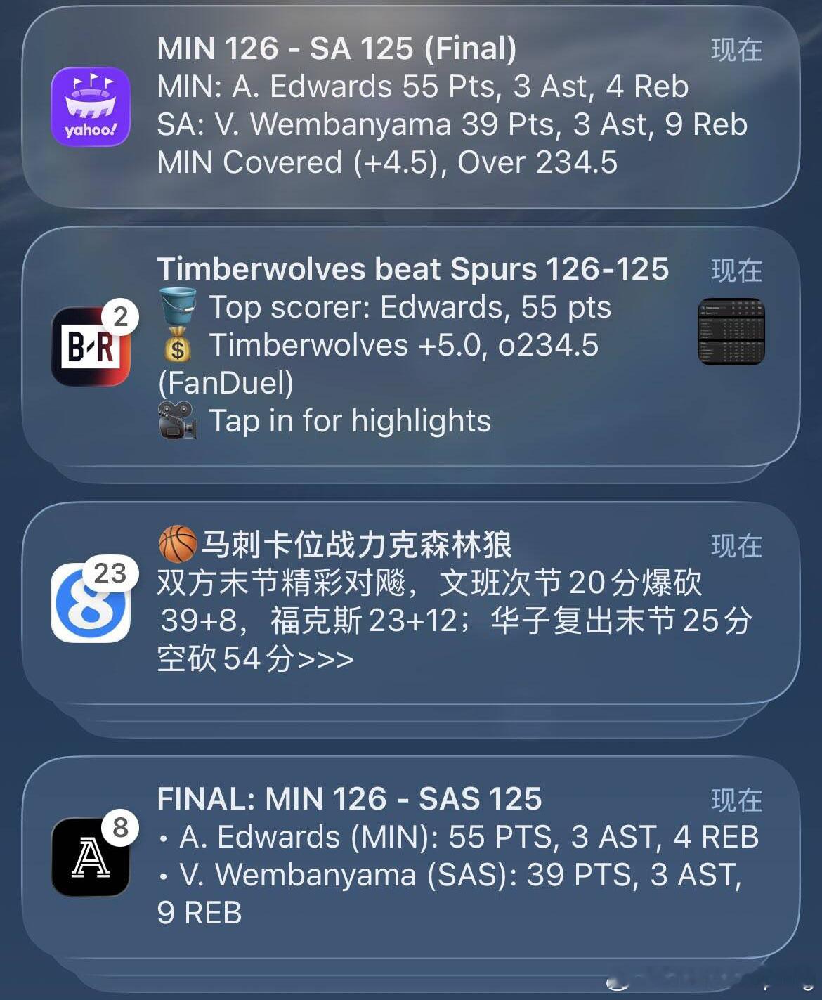马刺拒绝森林狼逆转,爱德华兹空砍生涯新高55分。文班第二节20分,末节12分,全场砍下39分,最后时刻隔着兰德尔抢到制胜前场板。森林狼下半场轰出79分,爱德华兹拼尽全力,最后时刻关键三分续命,但可惜被点球两罚中一。不过最值得一提的是,美国那边计分系统出问题了,好几家美媒比分和赛果都错了,把虎扑也晃到了。森林狼惜败马刺爱德华兹55分生涯新高文班亚马