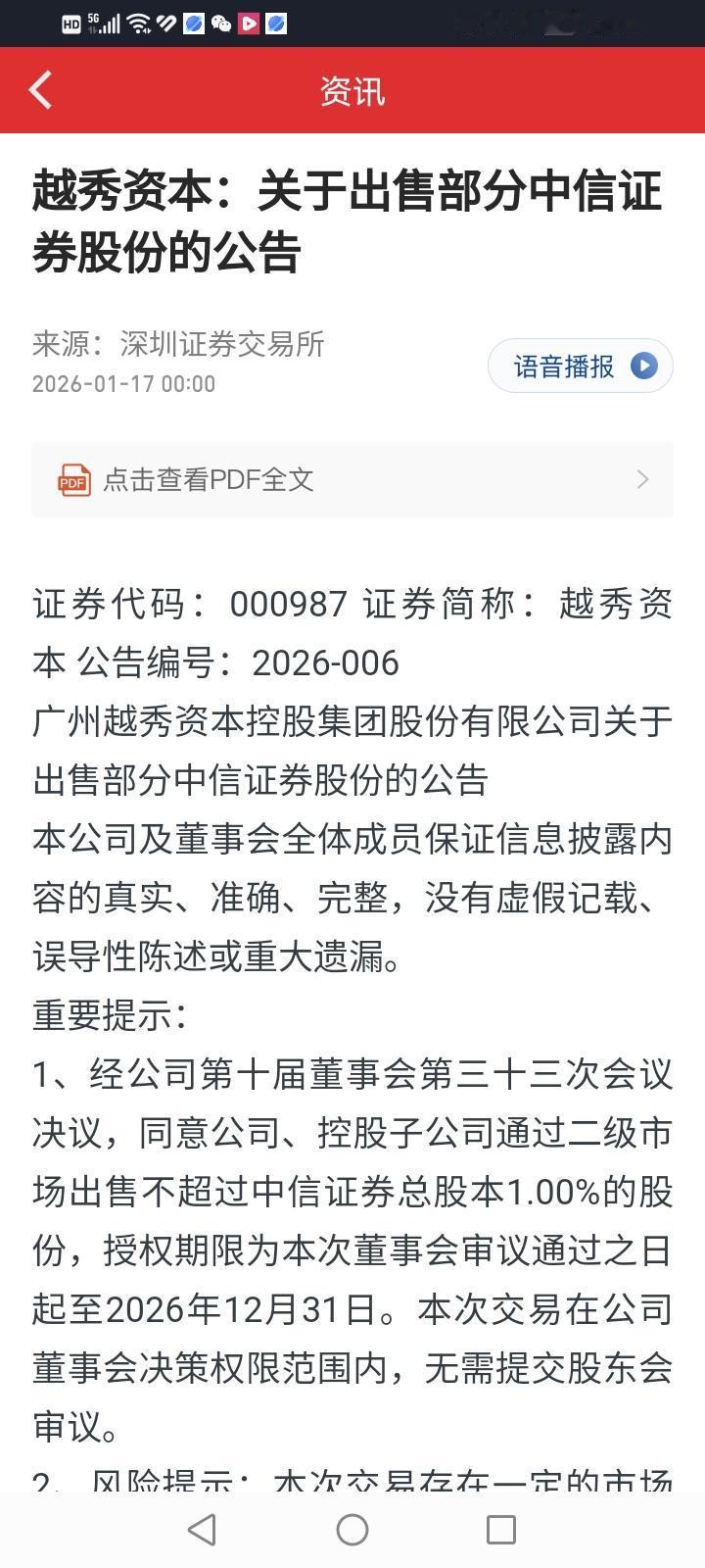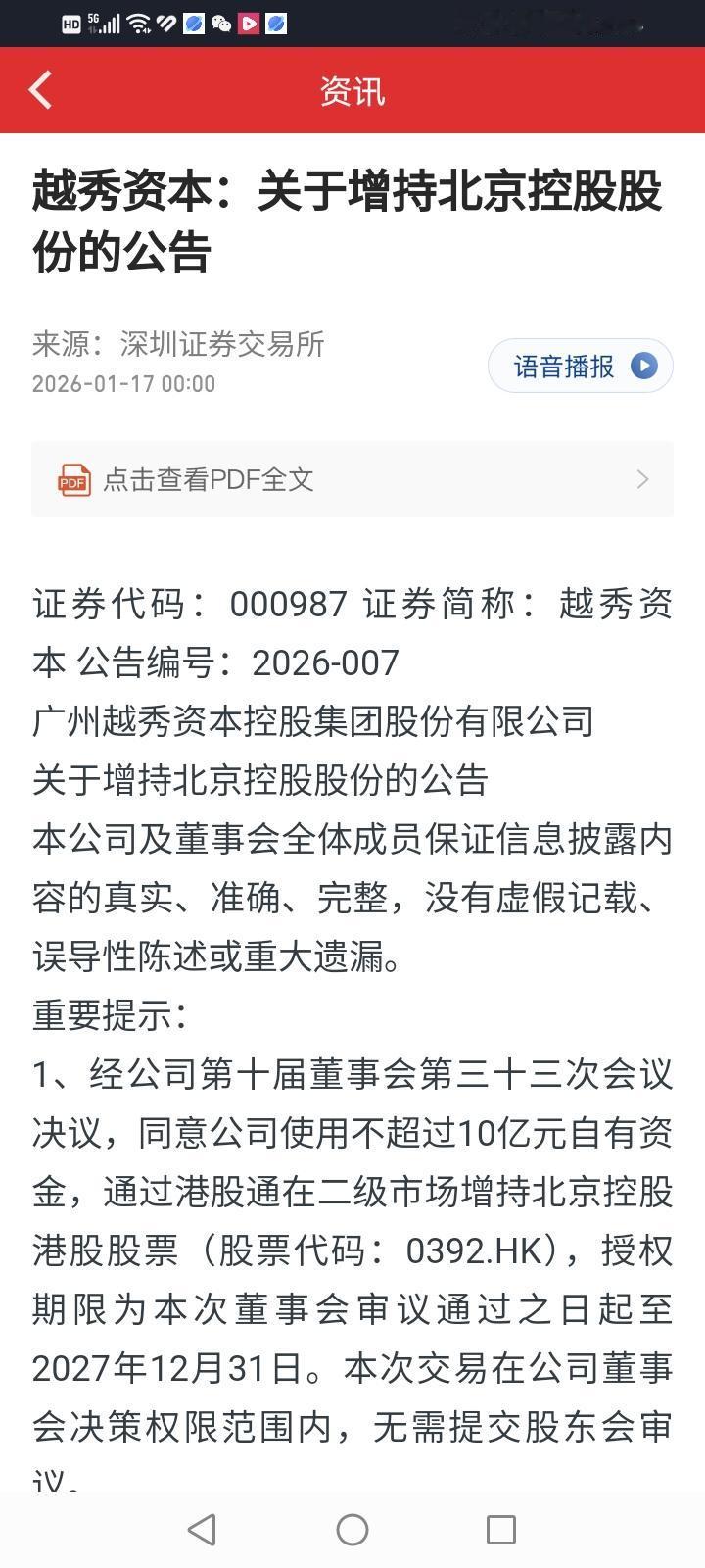 什么情况?越秀资本1月17日同时披露两个公告,左手减持中信证券,右手增持港股北京控股。 越秀资本2024年公告减持中信证券,中信证券股价2025年碰巧一年没敢涨。 没想到2026年新年伊始,越秀资本又发公告要减持中信证券。会对中信证券股价走势产生影响吗? 越秀资本要增持的北京控股,是一家从事燃气业务的公共事业港股上市公司,市盈率5倍左右,市净率仅0.6倍,估值确实偏低。但按照咱大A股民的炒股逻辑,北京控股从事的燃气业务是朝阳行业吗?似乎也不算。 这也许就是专业投资资本与咱小散的区别吧,专业资本看重的是安全边际和长期收益率,而散户看的是短期交易价值和情绪价值。专业资本是长期运作,逆向操作,而散户则是追涨杀跌。