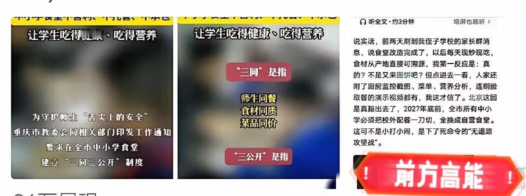 这两天看到一则 振奋人心的好消息: 重庆、北京即将收回中小学食堂经营权! 规定各中小学必须自办食堂,食堂不得营利、不得承包,让学生吃得营养、吃得健康! 承包食堂的乱象早该被彻底整治,资本逐利的本性只会把孩子的饭碗当成赚钱工具,把本该用在食材上的费用大幅压缩,全是从孩子嘴里硬生生抠出来的利益。 重庆7部门早早就出台硬性规定,校园食堂严禁托管承包或变相承包,必须守住公益非营利底线,每一分餐费都得花在食材上,把孩子饮食安全防线扎牢。 北京更是直接给出明确落地时间表,到2027年底,全市中小学要全面告别校外配餐,实现校内自办食堂,彻底甩掉那些没营养还满是工业感的冰冷盒饭。 过去承包模式里,食材成本占营收比例大多不到40%,肉蛋果蔬全靠凑数应付,自办食堂能把食材占比提至65%以上,差价全实实在在端上孩子的餐盘。 两地都明确大宗食材要走集中采购,米面油肉蛋奶统一选优质供应商,从源头就把控好品质,绝不让任何劣质食材溜进孩子的校园食堂。 智慧监管也同步跟上,明厨亮灶实现后厨24小时全程可视,食材溯源能一路查到田间地头,每样食品还得留样48小时以上,啥猫腻都藏不住。 家长再也不用当只能着急的旁观者,两地都要求建家长膳食委员会,全程参与食谱制定、食材验收,实打实的监督权直接交到家长手里。 人大代表督导时曾发现,某学校三千名学生一天只采购7斤猪肉,其余全用廉价鸡肉替代,孩子正处生长关键期,长期营养跟不上会耽误发育,这样的乱象早该退场。 孩子吃饭这件事半点马虎不得,三餐营养够不够,直接关系到身高发育、课堂状态,吃得好才能学得好,这是所有家长都懂的硬道理。 北京还创新推出中央厨房+微厨模式,破解了中心城区学校场地不足的难题,目前重庆部分区县试点严禁非寄宿校设小卖部,杜绝零食抢占正餐的营养空间。 多地自办食堂已有成功范本,官方调查显示,鹤壁自办食堂学生满意度高达93%,家长放心率更是达到100%,10块钱就能吃到四荤两素自助,营养性价比双在线。 这场改革本质是教育公益属性的回归,把被资本侵蚀的校园餐饮权收回来,拒绝拿孩子的健康换利润,这才是教育该有的温度和担当。 北京2027年底全面落地自办食堂的要求必须抓实,重庆的硬性规定也得执行到位,食堂财务要专账核算,餐费专款专用,严防暗箱操作和权力寻租。 家长们盼的从来都特别简单,就想孩子在学校能吃上热乎饭、营养餐,不用每天操心孩子饿肚子、吃不好,更不用额外准备加餐补营养缺口。 校园餐改革是场必须打赢的硬仗,孩子的饭碗里装着一个个家庭的期盼,更连着民族的未来,斩断资本逐利链条,才能让营养跟上成长脚步。 这两项政策精准戳中家长痛点、社会难点,只要落地到位、监管到底,每个孩子都能在校吃得营养健康,千万家庭也能少一份焦虑、多一份安心。 各位读者你们怎么看?欢迎在评论区讨论。 学校食堂经营