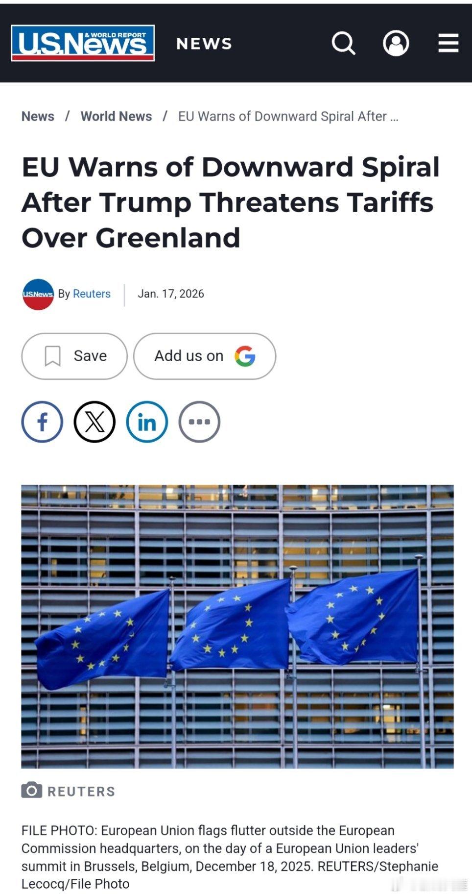 特朗普向欧洲8国加征关税特朗普就格陵兰岛问题威胁加征关税后,欧盟警告局势可能会陷入恶性循环。(路透社布鲁塞尔 1 月 17 日电)——欧盟领导人周六警告称,由于美国总统唐纳德·特朗普宣称要对欧洲盟友实施越来越高的关税,直至美国能够购买格陵兰岛,这将导致“危险的恶性循环”。“关税将会损害跨大西洋关系,并有可能引发危险的恶性循环。欧洲将保持团结、协调,并致力于维护自身的主权。”欧盟委员会主席乌尔苏拉·冯德莱恩和欧盟理事会主席安东尼奥·科斯塔在推特上发文如是表示。该集团的首席外交官卡娅·卡拉斯表示,这些关税举措将损害大西洋两岸的经济繁荣,并分散欧盟专注于“核心任务”(即结束俄罗斯在乌克兰的战争)的精力。“关税可能会让欧洲和美国变得更加贫穷,并破坏我们共同的繁荣局面。如果格陵兰的安全受到威胁,我们可以在北约内部解决这个问题。”欧盟 27 个成员国的外交官将于周日召开紧急会议,讨论针对关税威胁的应对措施。(美国新闻网)