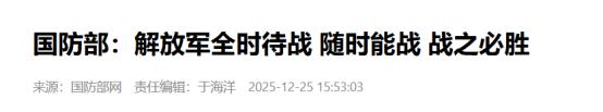 摊牌了,直接下通牒!2025年12月25日,国防部做出回应:统一不是2027,也不是2030,而是随时能战,战之必胜!   近几年,尤其是2025年,国际局势极其不稳定。多个国家爆发军事冲突的时候,很多国家也陷入了内乱。   而在这个背景下,我国的台湾问题进一步突出。针对台湾问题,我国多次表态。但仍旧有一部分国家在我国三令五申的前提下,试图干涉我国的内政。   在日本首相发表错误涉台言论后,美国试图借这件事情,再次去炒作“中国威胁”等各种言论。而在一些国家的恶意扭曲下,一些有关台湾的说法也油然而生。例如大陆会在2027年的时候武力统一台湾,又例如最迟是2030。   类似说法持续增加,针对这一点,2025年12月25日的时候,国防部做出了回应。据国防部发言人明确表示,关于统一这一点,解放军全时待战,随时能战,战之必胜。也就是说统一不是2027年,也不是2030年,而是随时能战!   其实像这样的说法并不是第一次出现,在2023年的时候,也曾出现过解放军2027年前攻台的说法。对于这一说法,当时国防部发言人就用两句诗来回应:“凡今之人,莫如兄弟”。   2023年的回应跟2025年的回应,出现了明显的区别,那就是用词强硬了起来。这直接证明了大陆的耐心,在逐渐的被消耗殆尽。如果民进党当局执迷不悟,勾连外部势力,不断的去破坏国家统一,那么大陆也会采取一些措施应对。   对此,您怎么看? (信息来源:国防部:解放军全时待战 随时能战 战之必胜-国防部网) (信息来源:解放军2027年前攻台?国防部回应了两句诗-观察者网)