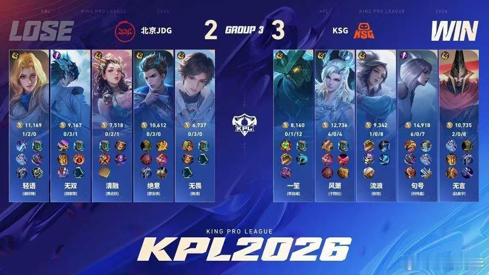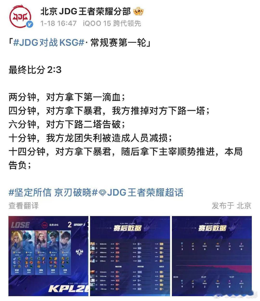 JDG对战KSG比分JDG赛后复盘 1月18日,2026KPL春季赛对战常规赛第一轮最终比分2:3,JDG赛后发文复盘:“两分钟,对方拿下第一滴血;四分钟,对方拿下暴君,我方推掉对方下路一塔;六分钟,对方下路二塔告破;十分钟,我方龙团失利被造成人员减损;十四分钟,对方拿下暴君,随后拿下主宰顺势推进,本局告负;”JDG对战KSG