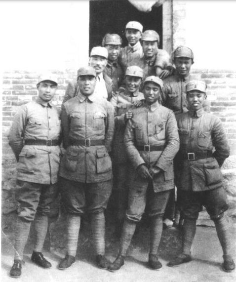 1939年,晋察冀军区部分干部合影。后排右一为邓华,前排左二为聂鹤亭、右二为萧克,二排中为萧克夫人蹇先佛、左一为孙毅,站在最后最高位置为舒同。