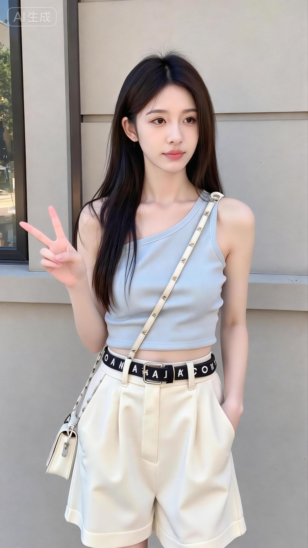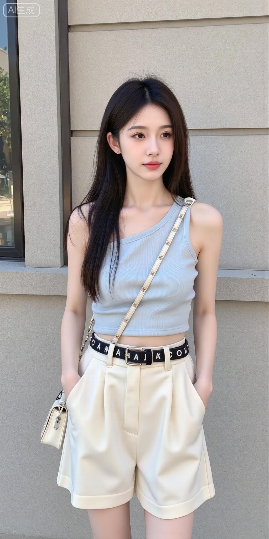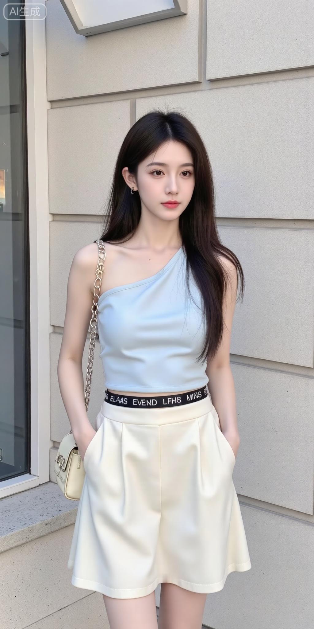 建筑旁的清透系少女 浅蓝斜肩上衣搭奶白短裤,像把初夏的凉感穿在了身上~链条包和字母腰边添了点时髦感,连素净墙面都成了她的简约滤镜✨ 是把“清冷松弛感”焊在身上的妹妹!夏干净风穿搭 浅蓝减龄穿搭