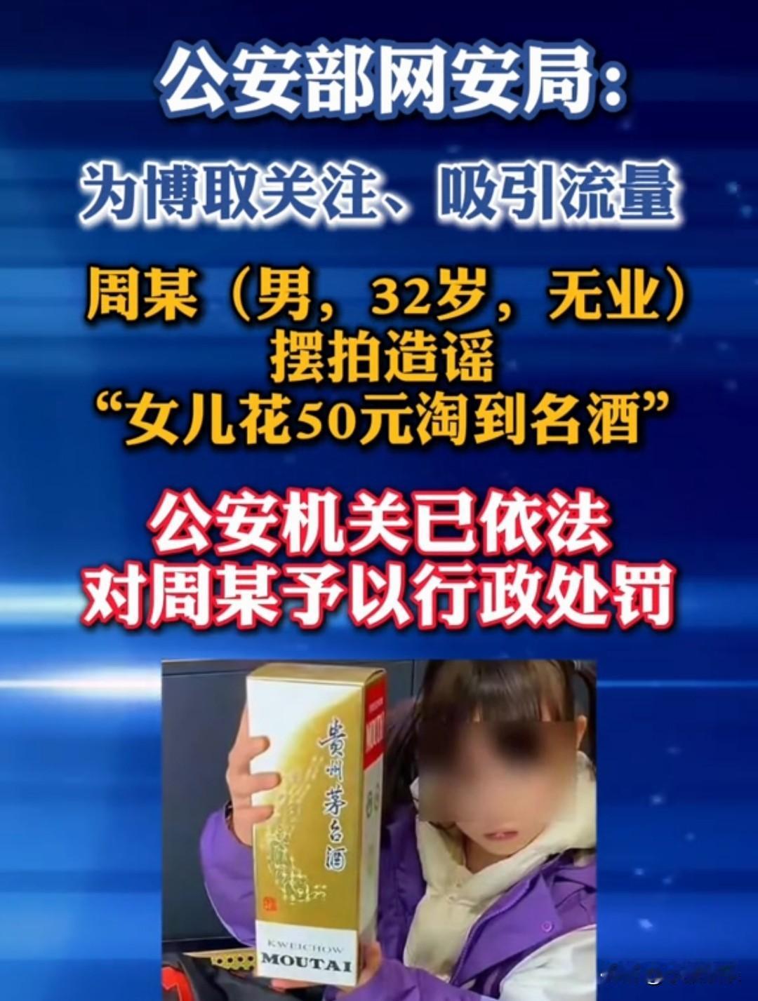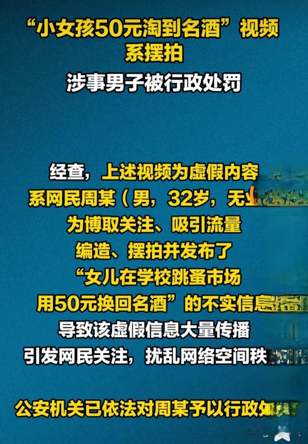 “到底是谁一直在透支社会的信任?” 最近一段小女孩用50元在学校跳蚤市场淘到名酒的视频,引发了网友讨论,现在已经确认是摆拍视频。 原因就是为了博取关注,吸引流量。最终男子被行政处罚。还是那句话,流量诚可贵,守法价更高。 如果所有人都为了流量,想尽办法博取眼球,那整个社会的信用就会被不断的透支,人们所看到的一切都是虚假的。带来的后果是不可以想象的。所以我们应该约束好自己。