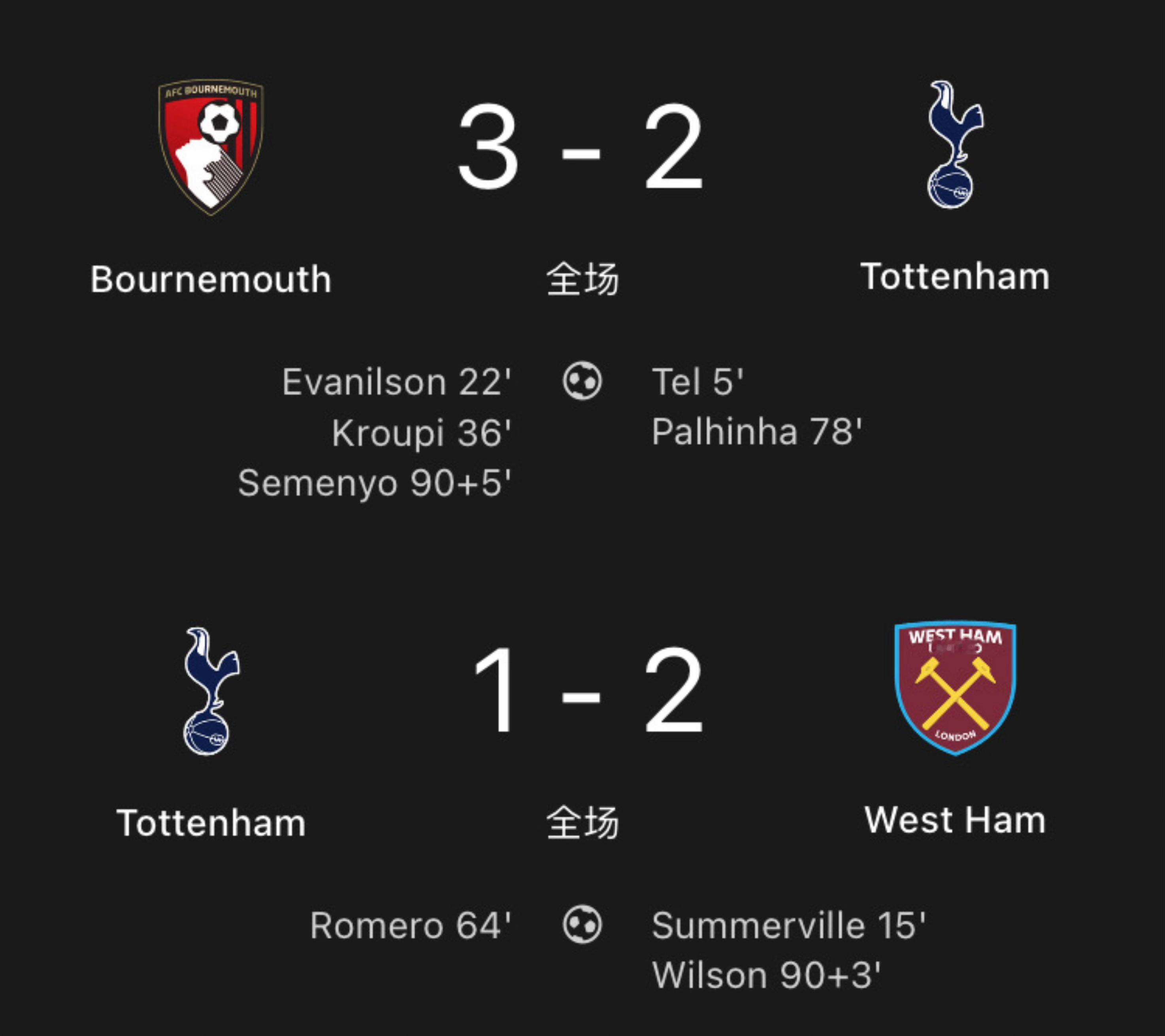 上一轮,伯恩茅斯在英超联赛中已经连续11场不胜,直到遇到并补时绝杀了托特纳姆热刺。本轮前,西汉姆联队在英超联赛中遭遇10场不胜,直到遇到并补时绝杀了托特纳姆热刺。托特纳姆热刺的下一场英超联赛将对阵伯恩利,伯恩利已经连续13场联赛未尝胜绩。