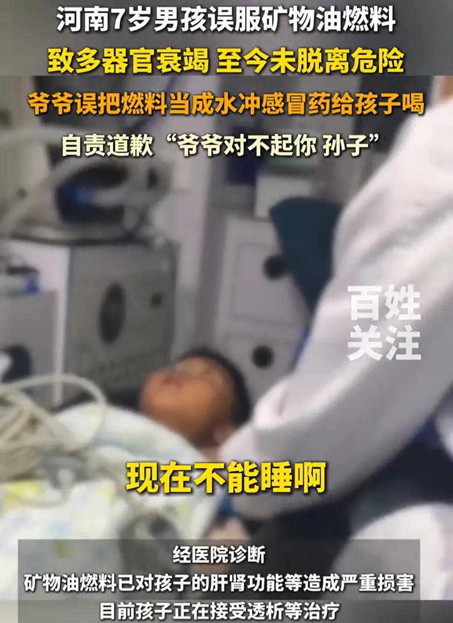 “天都塌了!”河南郑州,一名7岁男孩感冒生病,爷爷就用矿泉水瓶里的水给孩子冲药喝,可孩子喝了一口就发现不对劲,随后更是呕吐不止,神志不清,爷爷打电话问孩子爸爸,才知道里面根本不是矿泉水,而是矿物油燃料 河南郑州的老胡同里,7岁的小虎缩在藤椅上咳得直发抖,爷爷瞅着心疼,转身就去桌角摸了瓶“矿泉水”。 拧开瓶盖倒了半杯,兑上温水就往感冒药里冲,小虎抿了一口,脸瞬间皱成一团:“爷,这水发苦。” 爷爷摆摆手,只当是孩子嫌药难吃,硬劝着又灌了两口。谁料刚放下杯子,小虎就捂着肚子蹲在地上,哇地吐了一地。 起初只是吐清水,没过十分钟,孩子眼神就直了,说话也颠三倒四,爷爷这才慌了神,哆哆嗦嗦摸出手机打给儿子。 电话接通的那一刻,儿子的吼声差点震破听筒:“那瓶不是水!是我从火锅店拿的矿物油燃料!” 救护车鸣笛穿巷而过时,小虎已经昏迷不醒。医院急诊室的灯亮了一夜,检查结果像块巨石砸在一家人心上——急性肝衰竭、肾衰竭,直接送进ICU。 守在重症室外,父亲蹲在墙角揪着头发哭,眼泪混着烟灰往下掉。他怎么也想不到,为了周末全家吃火锅攒的燃料,会被父亲误当成水。 爷爷坐在走廊的长椅上,枯瘦的手反复摩挲着衣角,嘴里翻来覆去就一句话:“是我糊涂,是我害了娃。” 网友的评论刷满了屏幕,有人骂爷爷粗心,有人怪父亲乱放东西,可谁都明白,这对祖孙父子,心里比谁都煎熬。 生活里的坑,往往藏在“随手”二字里。用饮料瓶装农药、用矿泉水瓶装清洁剂,这样的事在寻常人家并不少见。 总觉得自己记着,总以为不会出错,可偏偏就是这些“想当然”,酿成了无法挽回的遗憾。有毒的从来不是矿物油本身,而是心存侥幸的疏忽。 医生说,小虎的肝肾损伤不可逆,后续还要经历漫长的治疗。这血淋淋的教训该醒醒了:危险物品,就得有危险物品的样子。 别图省事乱装容器,别嫌麻烦懒得贴标签,更别把隐患藏在孩子够得到的地方。有时候,多一分谨慎,就能少一场悲剧。