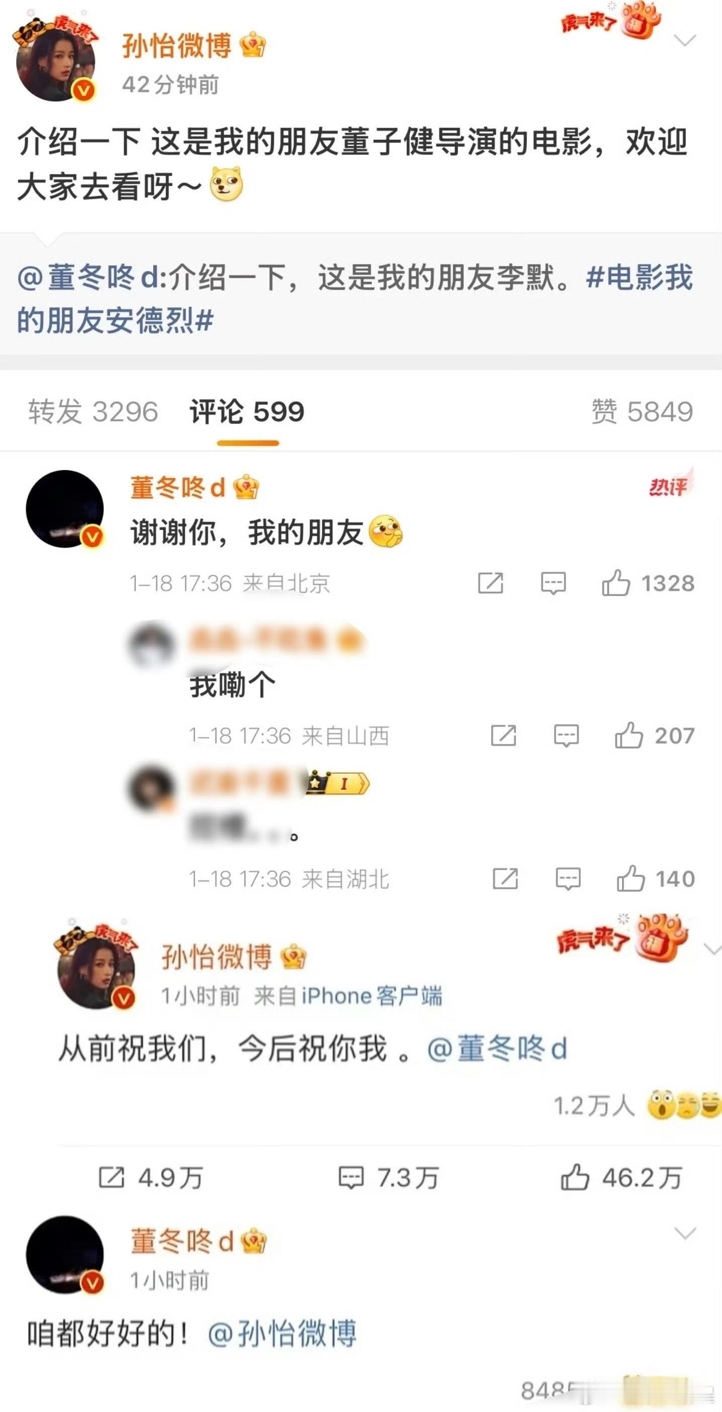 董子健回复孙怡官宣离婚之后很久没互动了,今天孙怡突然给前夫宣传电影,难道是有望复