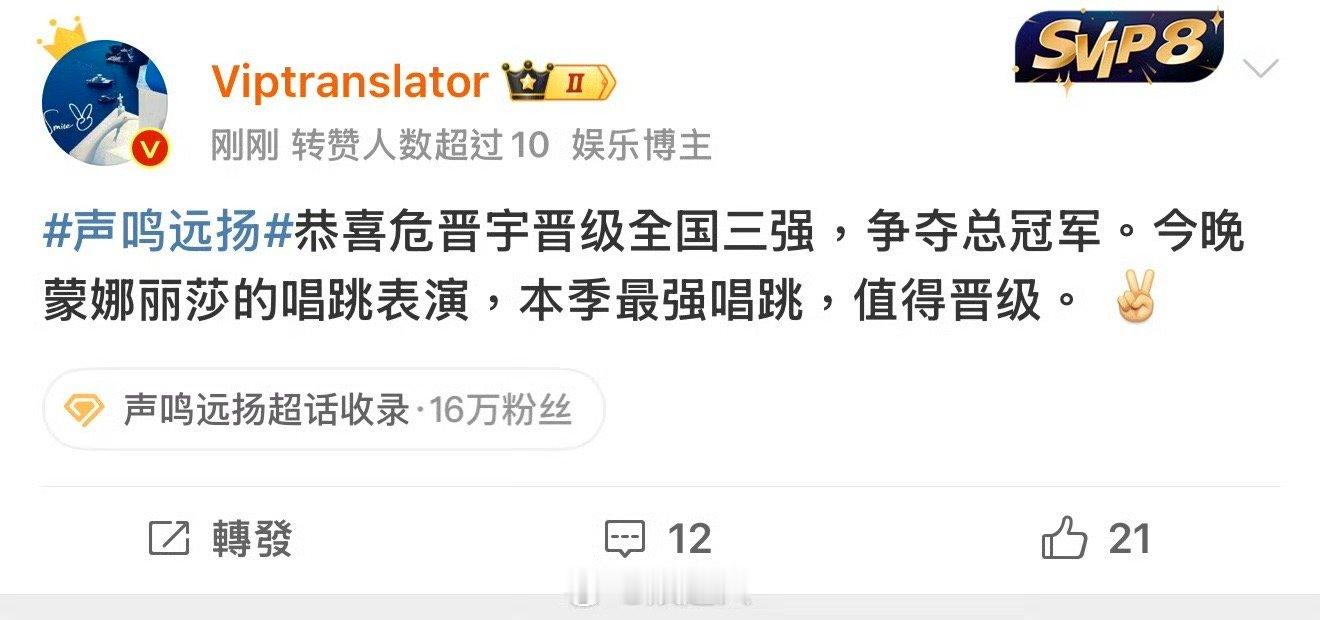 有生之年也是看到美声选手唱跳了危晋宇封神舞台再加一!声鸣远扬 一改之前的美声风格搞起动感唱跳,也是看到声选手唱跳了!精彩程度拉满了