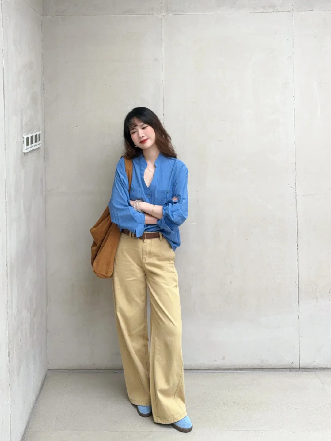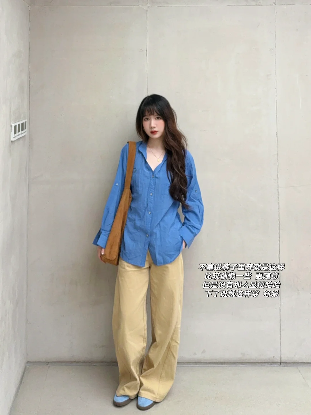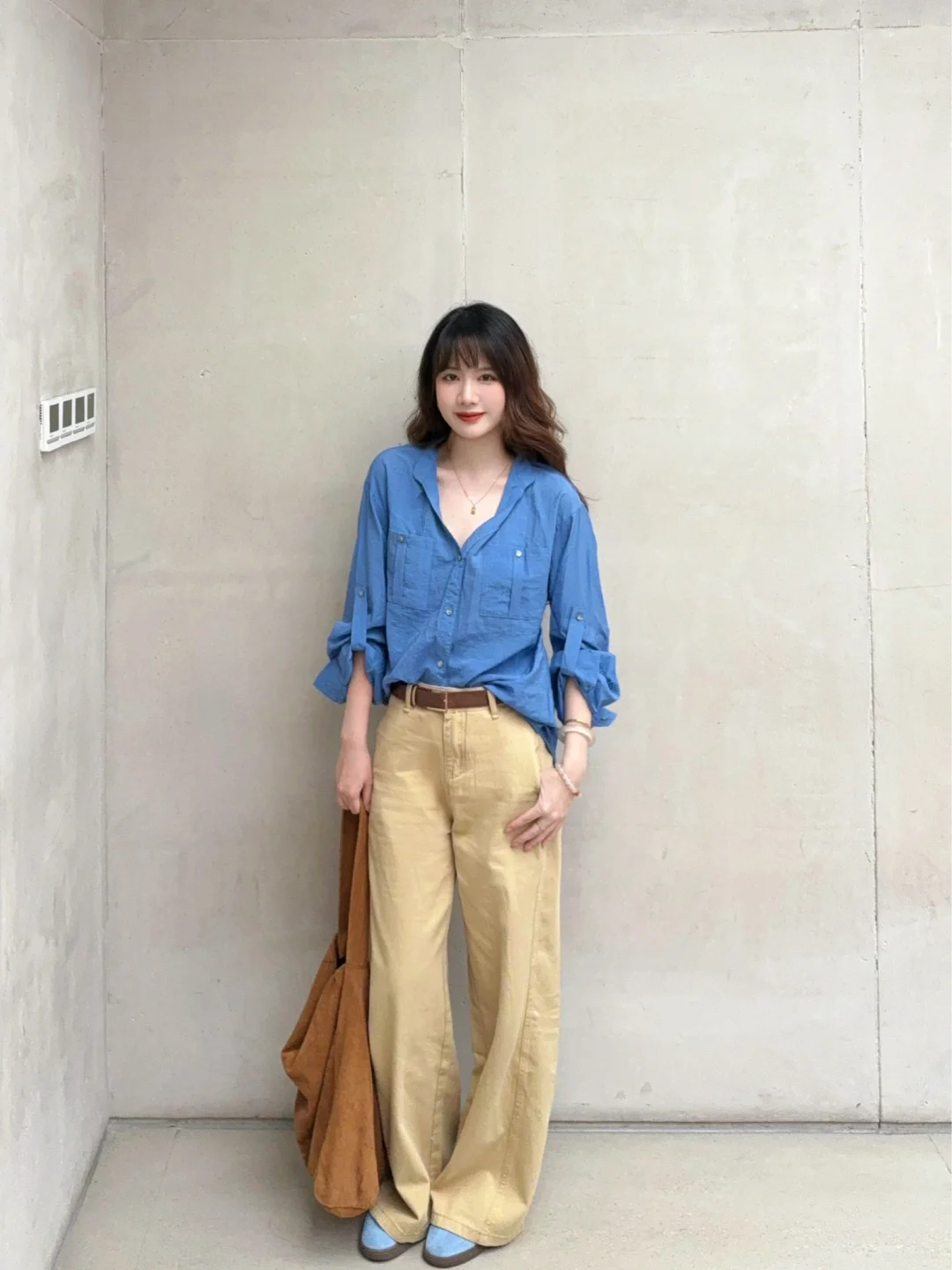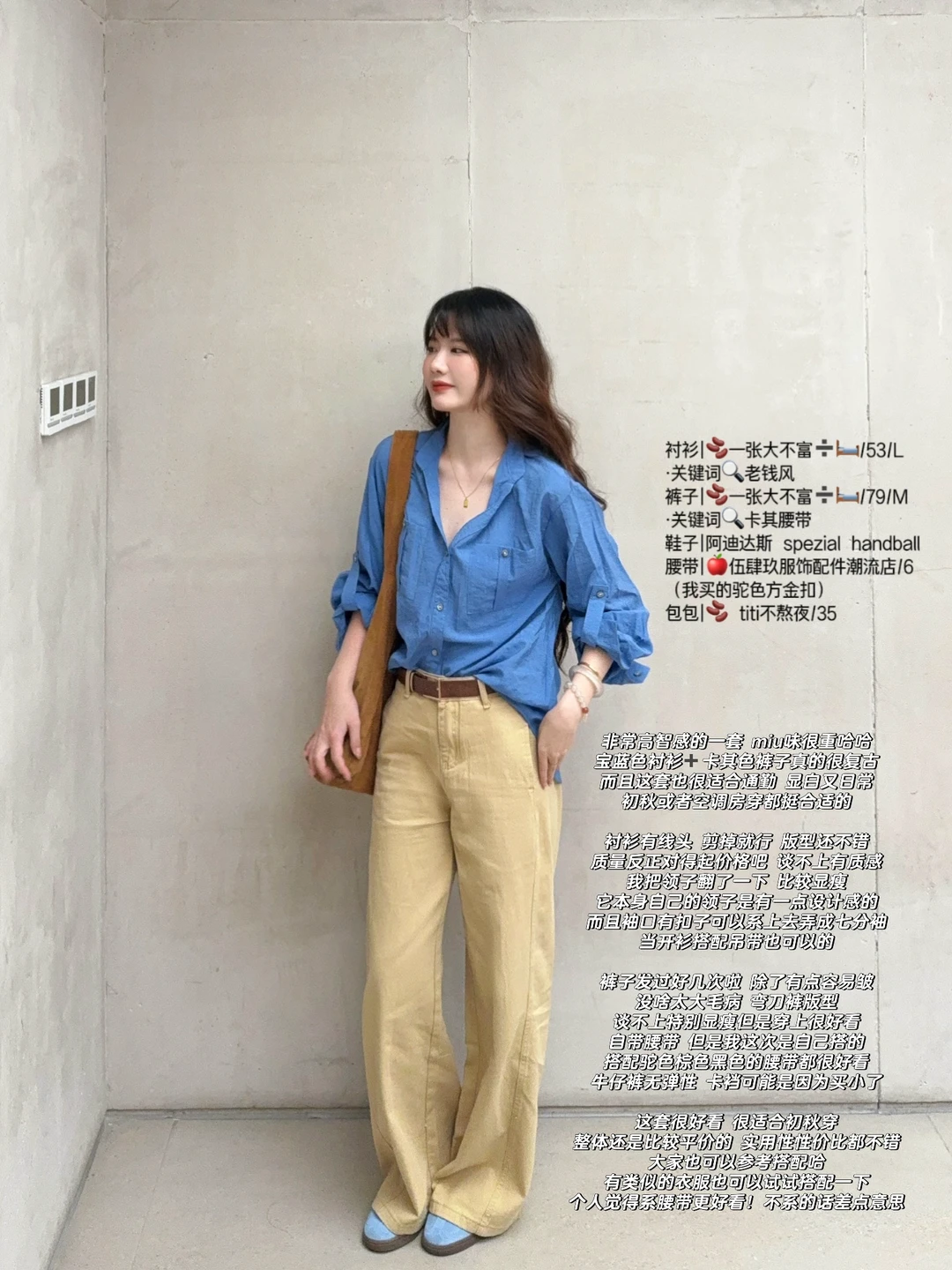 168/104左右 纯分享 理性种草 有人想看入秋穿搭 我赶紧来发一下 立秋第一套OOTD 很好看 我个人很爱~ 比较适合通勤 又很有氛围感 高智感直接拿捏 今年秋冬肯定很流行宝蓝色➕卡其色 非常好看的撞色搭配 日常又显白 蓝色衬衫➕棕色系的下装 miu感很重🫰🏻 谁能想到这套这么平价呢哈哈哈哈 其实看起来还蛮贵的