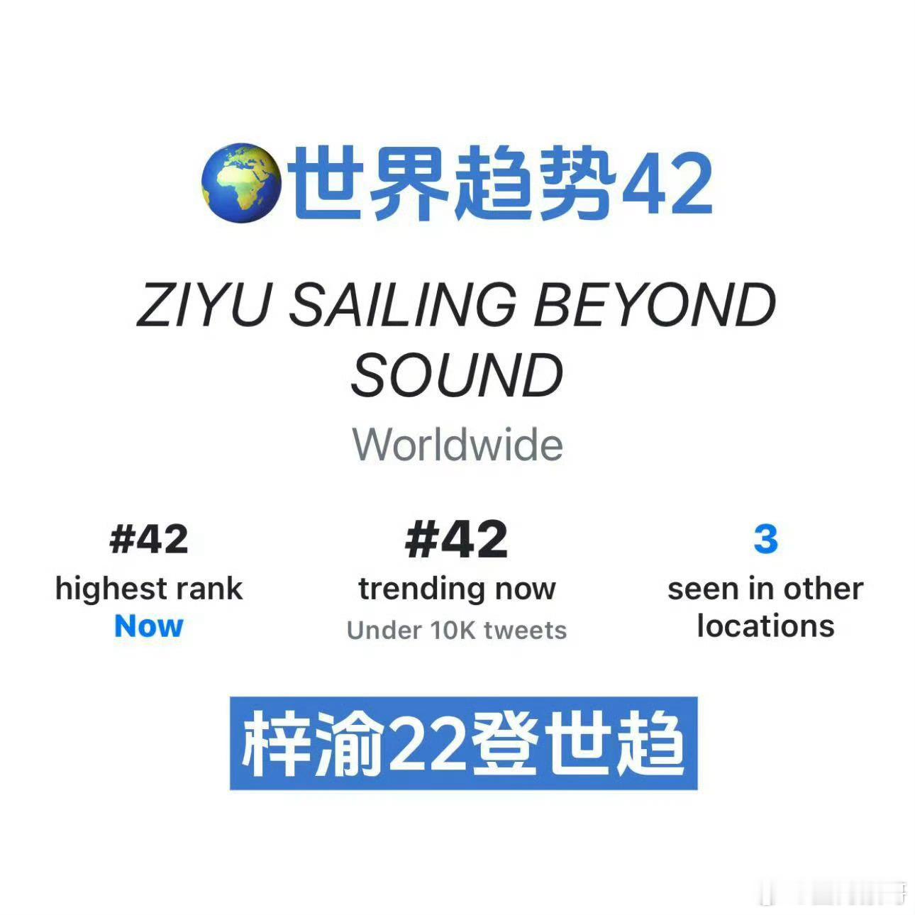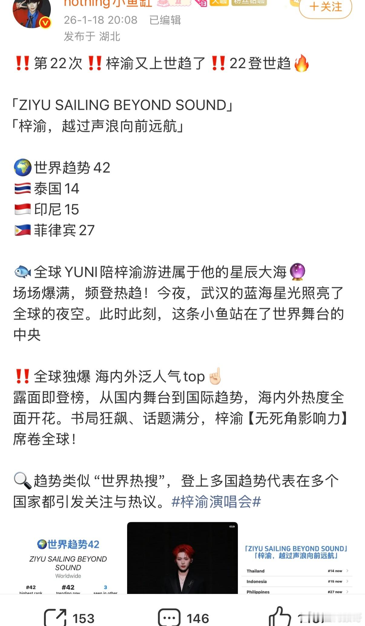 梓渝海内外都这么🔥啊,今晚因武汉演唱会第22次登上世趋了诶,而且今天可能会再多