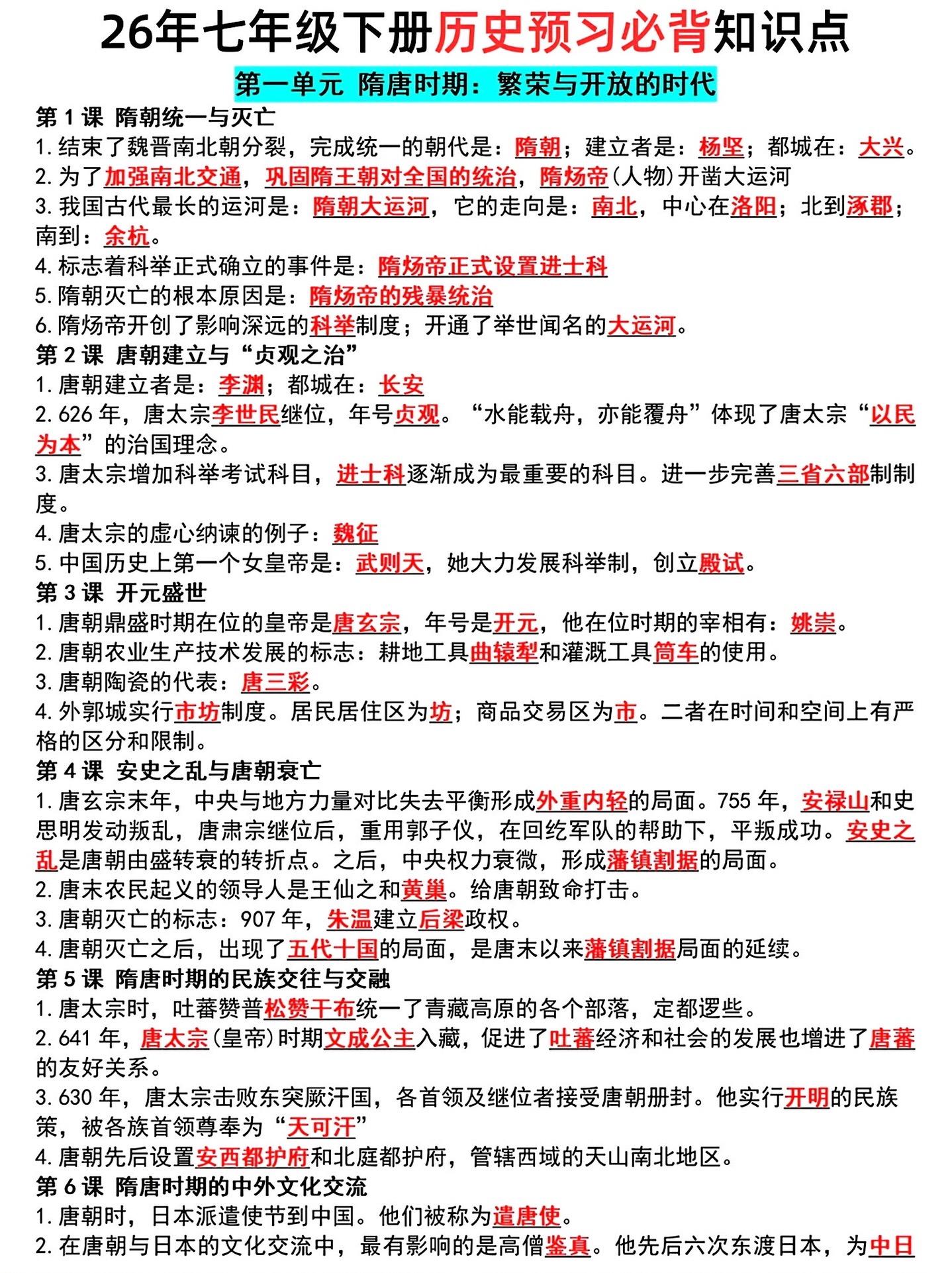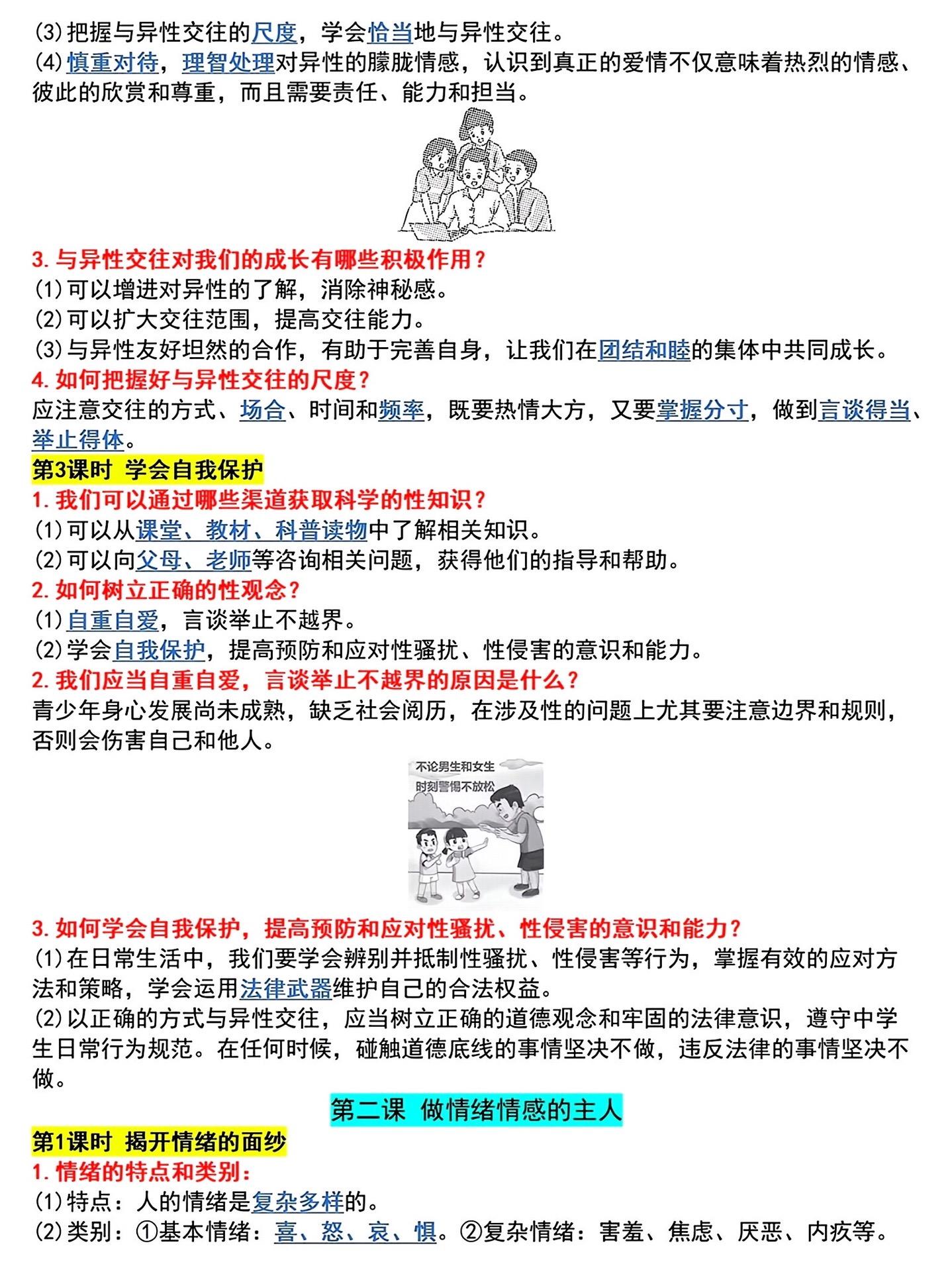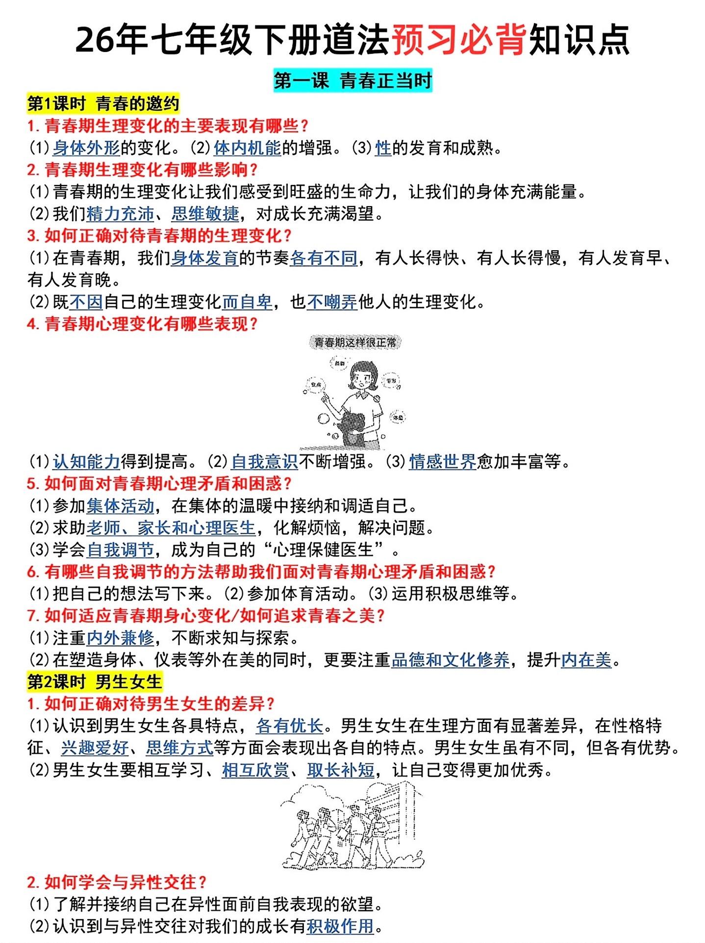 七年级下册寒假预习小四门必背知识点汇总。