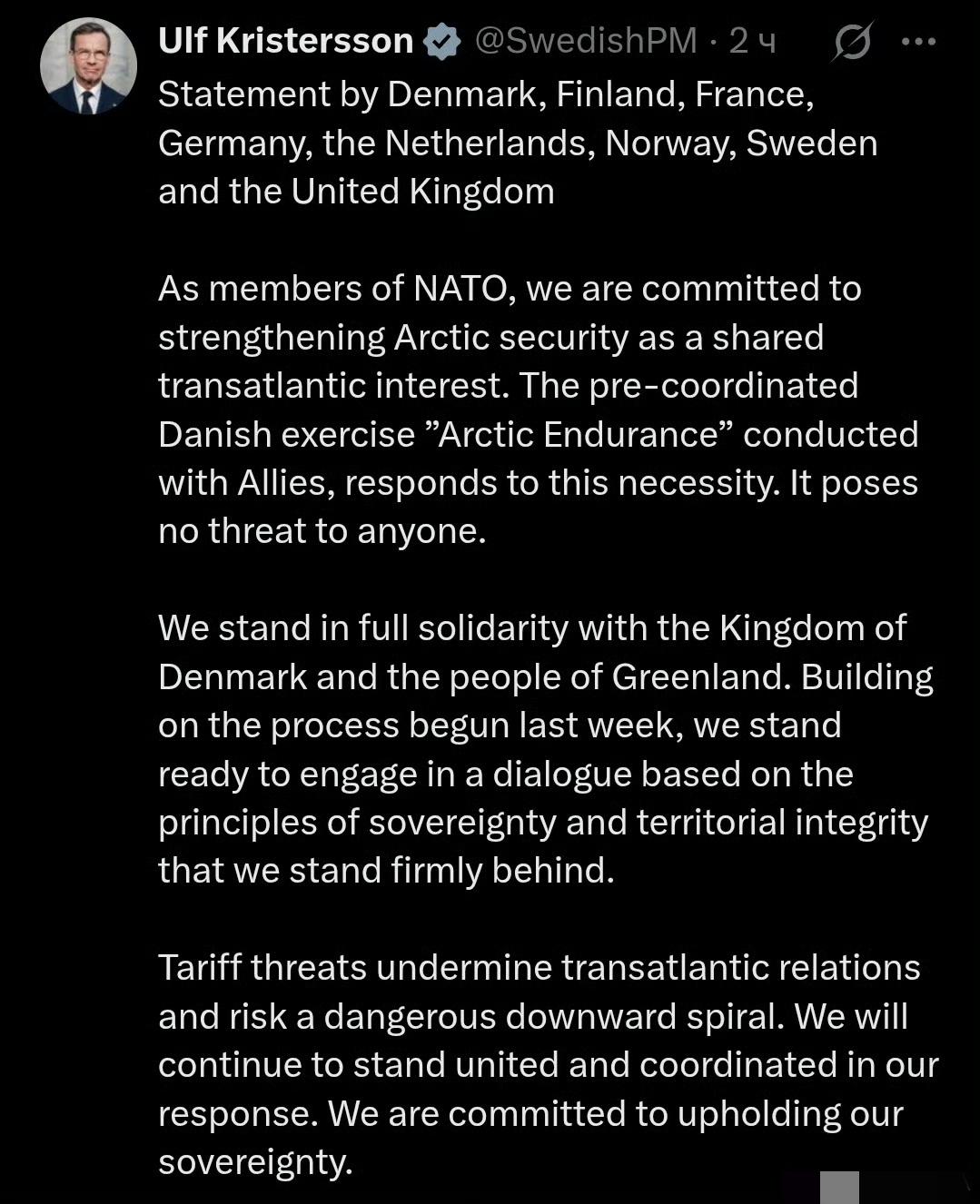 意大利防长嘲讽欧洲各国派兵格陵兰岛。 格陵兰虚拟防御集团军--- 丹麦、芬兰、法国、德国、荷兰、挪威、瑞典和英国联合声明: 作为北约成员国,我们致力于将加强北极安全作为共同的跨大西洋利益,与盟国协调开展的“北极韧性”(Arctic Endurance)演习正是对此需求的回应,此举对任何国家都不构成威胁。 我们完全声援丹麦王国和格陵兰人民,愿在上周启动的进程基础上,基于主权和领土完整原则开展对话。 关税威胁破坏跨大西洋关系并可能引发危险的恶性循环,我们将在应对中保持团结与协调,坚定维护自身主权。
