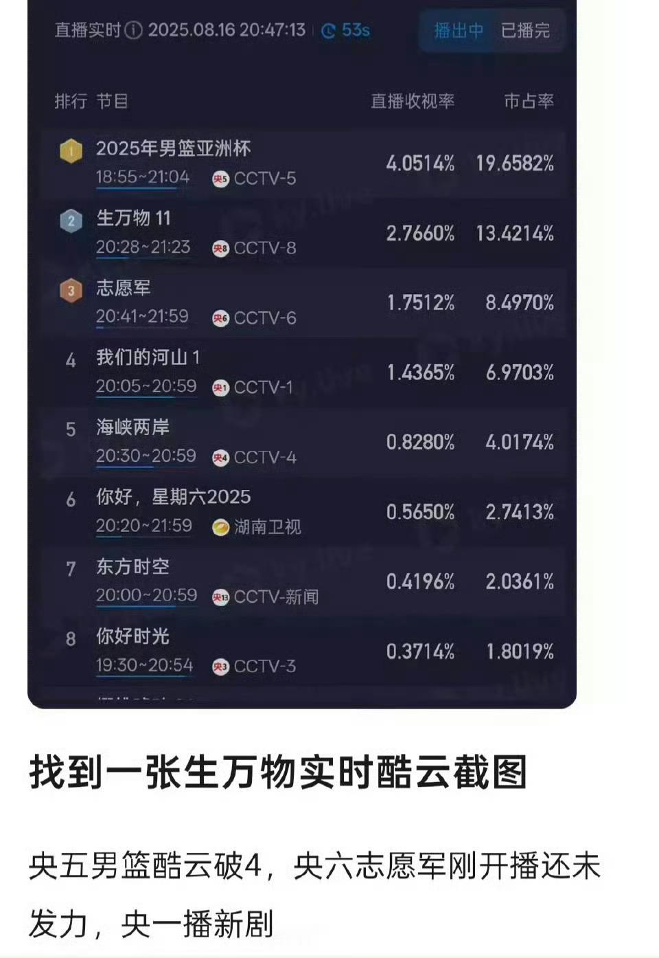 生万物播的时候又是央六战争片,又是央一篮球,还是三集连播,每次留下来的是真观众!