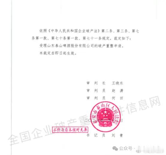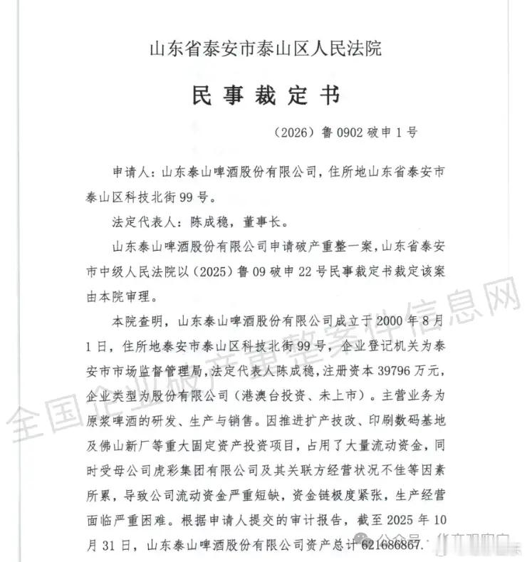 6.6亿欠债,泰山啤酒破产!来源:市场资讯2026年1月13日,山东省泰安市泰山区人民法院作出《民事裁定书》[(2026)鲁0902破申1号],依法受理山东泰山啤酒股份有限公司(以下简称“泰山啤酒”)的破产重整申请,标志着这家深耕国内啤酒市场二十余年的企业正式进入司法重整程序,通过法律途径寻求债务化解与经营重生。据法院审理查明,泰山啤酒成立于2000年8月,是一家在全国布局3000余家专营门店的啤酒企业,产品营销模式、产品技术储备和技术革新能力、品牌生命力等方面均具有一定优势。近年来,公司因推进扩产技改、印刷数码基地及佛山新厂等重大固定资产投资项目,占用大量流动资金;同时受母公司虎彩集团有限公司及其关联方经营状况不佳等因素所累,出现流动资金严重短缺、资金链极度紧张的问题,生产经营陷入严重困境。截至2025年10月31日,经审计确认,泰山啤酒资产总计约6.22亿元,负债总额约6.63亿元,资产负债率达106.63%,已资不抵债,且存在多笔大额到期债务无法清偿的情形。此前,泰安市中级人民法院于2026年1月9日作出裁定,鉴于泰山啤酒的住所地、主要财产所在地、核心债权人及职工均集中于泰山区,且泰山区人民政府已成立清算组,为便于案件审理、矛盾化解与社会稳定维护,经报请山东省高级人民法院批准,指定泰山区人民法院审理此案。泰山区人民法院经审查认为,泰山啤酒已不能清偿到期债务,且资产不足以清偿全部债务,明显缺乏清偿能力,具备破产原因,同时具备重整价值与可能性,故依照《中华人民共和国企业破产法》相关规定,裁定受理泰山啤酒的破产重整申请。虎彩集团总部 来源 虎彩集团官网事实上,泰山啤酒的债务危机早有端倪。2025年10月,泰山啤酒母公司虎彩集团被自身沉重的债务负担压垮。虎彩集团控股子公司虎彩印艺股份有限公司已正式进入破产重整程序,而受到大股东的拖累,泰山啤酒的多数股权也遭到轮番冻结。更早之前的2025年4月,国家税务总局泰安市税务局发布欠税公告决定书(泰税欠公字〔2025〕2号),公告显示,泰山啤酒存在大额欠税情况,欠税总额达536.76万元。2025年12月31日,山东泰山啤酒股份有限公司总经理张开利在泰山啤酒直营十周年大复盘暨2026年高质量发展战略规划大会上致辞 来源 泰山原浆啤酒公众号耐人寻味的是,与债务缠身的窘境形成鲜明反差的是企业对外释放的“繁荣信号”。2026年元旦当天,泰山啤酒通过官方账号连发两条重磅推文,高调宣布招商新政,并提到“2025年,泰山原浆啤酒专营店全国新增门店达776家,并创下啤酒行业单场招商283家的新纪录”。前一天举办的“泰啤直营十周年暨2026年战略规划大会”更是一派热闹景象,企业高管明确提出“理产品、控价盘、保利润、拓门店、增销量、重推广”的2026年发展策略,勾勒出信心满满的扩张蓝图。