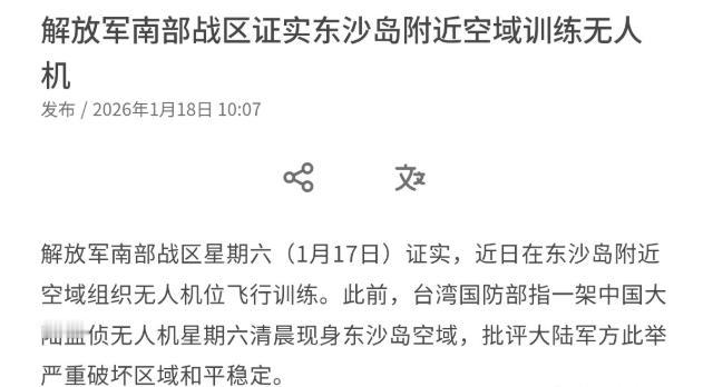美国军舰刚经过台湾海峡,没想到解放军突然证实了一个大消息,这引起外媒格外的关注! 1月18日,联合早报刊文声称,解放军南部战区已经证实,近日在东沙岛附近空域组织无人机位飞行训练。联合早报表示,此前,岛内指一架中国大陆监侦无人机星期六清晨现身东沙岛空域,批评大陆军方此举“严重破坏”区域和平稳定。 而我们解放军南部战区则回应称,近日,南部战区组织无人机在东沙岛附近空域进行正常飞行训练,完全正当合法。 岛内某些势力之所以反应这么大,说白了就是心虚。别看他们嘴上喊得凶,实际守着东沙岛的力量薄弱得很,满打满算就200名海巡人员,装备也都是些40毫米防空炮、80毫米反坦克火箭筒之类的家伙事儿,跟解放军的装备比起来,根本不在一个量级。 之前他们也想补强,偷偷搞东沙机场跑道扩建,还部署了锐鸢无人机和蜂眼雷达,折腾来折腾去也改变不了防御薄弱的现实,专家都分析过,以解放军海军陆战队和特种部队的实力,要控制东沙岛也就一两个小时的事儿,还犯不着动用大规模兵力。 现在解放军只是派无人机去附近训练,他们就急着跳出来指责,无非是怕暴露自己的底气不足,想靠喊口号给自己壮胆。 近五年来,解放军在包括东沙周边在内的多个海空域组织类似训练已经超过200次,平均下来差不多每周就有一次,早就成常态化的练兵操作,目的就是提升部队的实战能力,尤其是无人机的远程侦察、目标识别和海空协同能力。 现在无人机在现代战争里的作用越来越大,数据显示在近年的地区冲突中,无人机承担了超过40%的侦察任务和25%的精确打击任务,效费比特别高,解放军加强这方面的训练,就是顺应军事发展趋势,把该有的本领练扎实,这就像普通人每天晨练强身健体,再正常不过了。 而且解放军的训练从来都公开透明,还会提前发布航行警告,避免误解误判,比某些国家在南海搞的秘密军演、挑衅性巡航规矩多了。 这里不得不提一句美国的小动作,他们才是搅动区域局势的幕后推手。美军近些年频繁派军舰穿台湾海峡,还动不动就联合日本、澳大利亚在南海搞军事演习,去年更是给菲律宾送了P-8A反潜巡逻机和MQ-9“死神”无人机,帮着构建所谓的南海监控网络,说白了就是想靠搅乱局势牟取私利。 这次美军舰刚过台海,解放军就展开无人机训练,某种程度上也是一种明确的态度——你能来我家门口晃悠,我就能在自家地盘练兵,你的所谓“威慑”没用,我们维护主权和领土完整的决心和能力就摆在这里。 别以为靠着几艘军舰、几架飞机就能左右局势,解放军的训练不是做样子,是实打实的战备,真要是有谁敢越雷池一步,绝对能让他吃不了兜着走。 说到底,解放军这次在东沙岛附近的无人机训练,就是一次常态化的、正当合法的军事练兵,既展示了维护主权的决心,也敲打了那些别有用心的势力。 岛内某些人与其忙着指责和炒作,不如认清现实,明白“台独”死路一条,任何分裂国家的企图都不可能得逞。 美军也别想着靠搅乱台海和南海局势牟取利益,解放军有足够的能力捍卫国家的领土和主权,不管是无人机训练还是其他军事行动,都会按照自己的节奏常态化开展,不会被任何外部势力干扰。 区域的和平稳定,从来不是靠某一个国家的挑衅和炒作就能维持的,而是靠尊重各国主权和领土完整,靠平等协商和互利共赢。