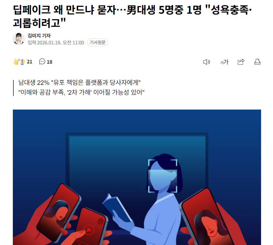 【调查:韩国1/5制作过Deepfake的男大学生承认“为满足性欲或骚扰”】海外新鲜事热点现场 调查显示,在有制作Deepfake(利用人工智能技术制作的假照片/视频)经验的韩国男大学生中,每5人就有1人是为了满足性欲或骚扰他人。此外,认为Deepfake色情合成物是犯罪的男学生明显较少,并且普遍倾向于认为制作和传播的责任在于平台以及未能管理好照片的当事人。18日,韩国女性政策研究院的赵海胜、金孝贞副研究委员和宋致善专业研究委员发表了《大学Deepfake性犯罪实况把握及研究应对方案制定的基础研究》报告,其中包含了上述研究结果。研究团队考虑到各地区分布,从全国大学生中抽样选取了1500名(男女各750名)进行调查。其中,回答有过制作Deepfake照片或视频经验的人共有218名(14.5%)。制作Deepfake的目的中,选择最多的是"用于学校课题"和"制作有趣的梗/玩笑","创作作品"、"朋友之间开玩笑"等也是主要目的。其中,男性受访者中,选择"满足性欲"(12.2%)和"骚扰对方"(8.4%)的比例相当高。如此回答的男性受访者比例是女性受访者比例的两倍以上。男学生对"Deepfake性犯罪"的认知程度与女学生也存在很大差异。女学生中,72.1%的受访者表示对Deepfake性犯罪"很了解",而男学生中这一比例仅为52.9%。调查还显示,当校园内发生Deepfake性犯罪事件时,男女之间的情感差距也很大。女学生中,回答"非常不安和恐惧"(31.4%)和"感到愤怒和震惊"(56.3%)的比例很高。相反,男学生中相应的回答率仅为9.9%和36.2%。男性受访者中,有42.7%的人回答"虽然惊讶,但对我没有直接影响"。这比女学生的回答率(11.2%)高出3倍以上。研究团队分析称:"以2024年为基准,Deepfake合成/编辑受害者中96.6%是女性","受害的性别化正导致认知的性别化"。接着解释道:"男学生倾向于认为Deepfake性犯罪是与自己无关的问题,或者采取将其视为个人行为而予以分离的态度","女学生则将此类犯罪视为与潜在受害风险直接相关的实质性威胁,而男学生则倾向于将其视为他者化的事件"。男学生对Deepfake性犯罪的理解和共情不足,显示出可能对受害者进行"二次加害"的倾向。在询问Deepfake色情合成物的制作/传播责任归属第一、二位的问题中,男学生最多地指向了"制作该合成物的人"(82.0%)和"薄弱的处罚"(51.6%)。然而,选择"未能妥善管理照片的人"(13.6%)和"未能阻止传播的平台"(22.5%)的比例也相当高。相比之下,女学生中,选择"未能妥善管理照片的人"的仅有4.9%,选择"未能阻止传播的平台"的也只有9.5%。对此,研究团队指出:"这表明,部分男学生中仍然存在将受害者疏忽视为问题原因的倾向","存在将需要从结构性性别暴力角度去处理的问题,转嫁给受害者自我管理失败的风险。"