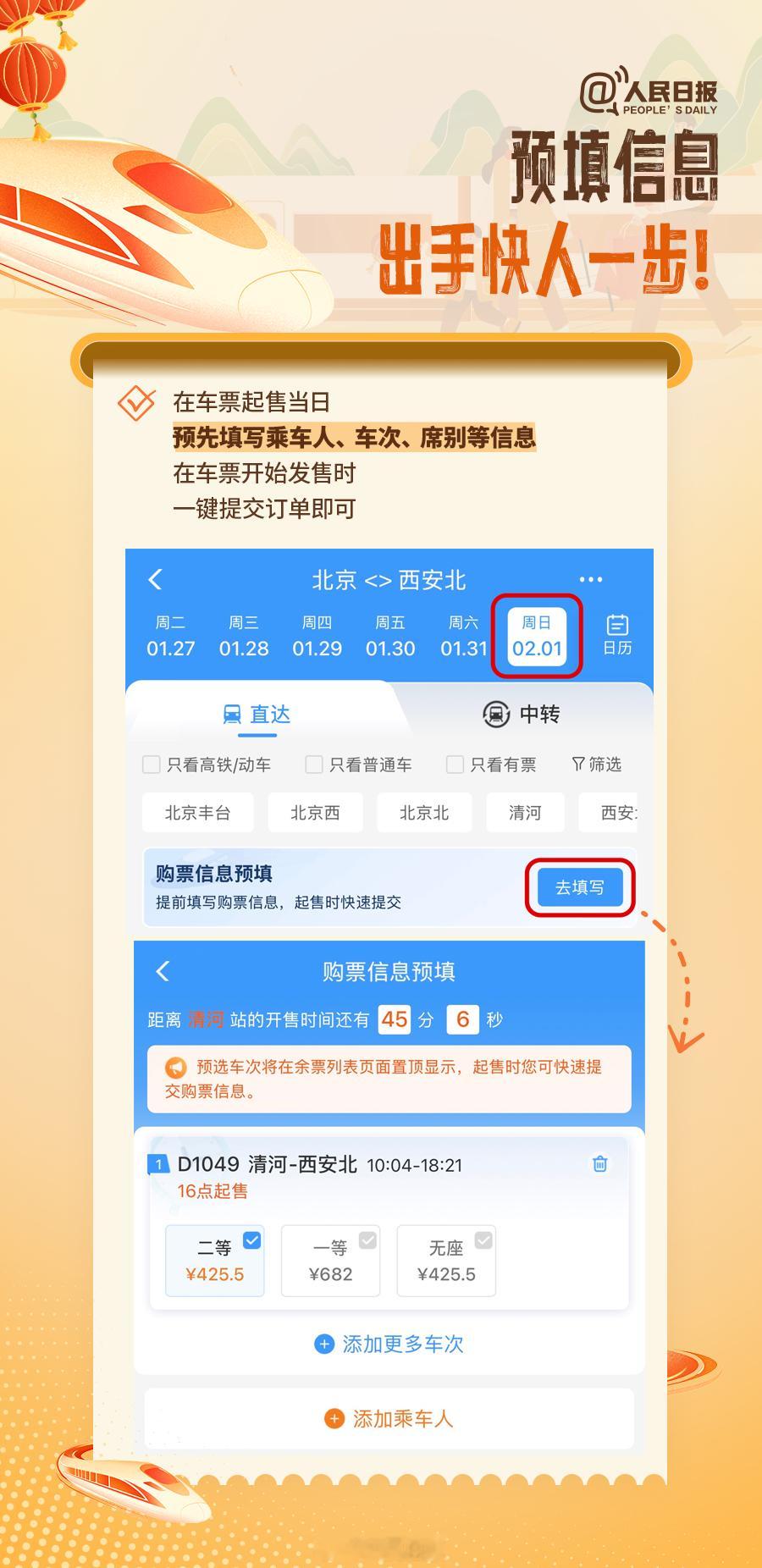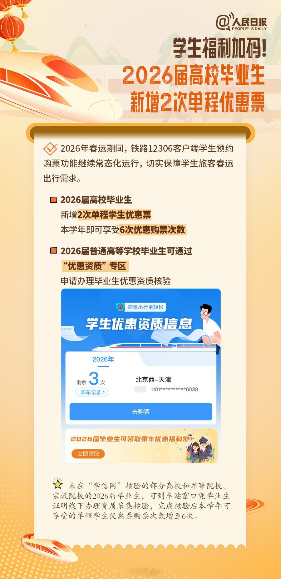 【2026年春运火车票开售】今起可买2026春运火车票2026年春运时间为2月2日—3月13日,共40天。买错火车票可限时免费退,“静音车厢” 服务将拓展至超8000列,务工人员预约购票更便捷......收好这份春运购票指南,回家的路超安心! (人民日报)
