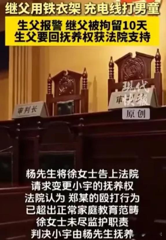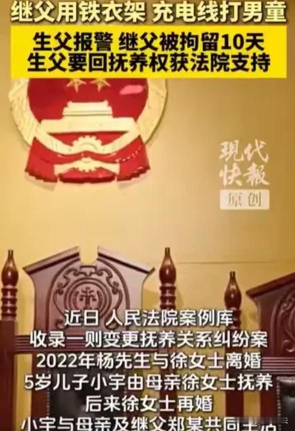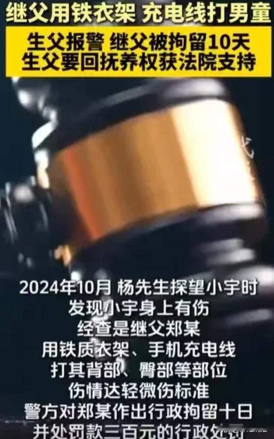 重庆,杨先生和前妻离婚后,儿子小宇跟着母亲生活,杨先生去探望7岁的儿子,发现小宇神情委屈、眼里无光。他心疼地询问,小宇撩起衣服,身上的伤痕让杨先生心如刀割。原来,继父用铁衣架和数据线殴打小宇。杨先生又气又急,他一直以为前妻能照顾好儿子,没想到儿子遭此毒手。他果断报了警,继父受到了行政处罚。杨先生决定要回抚养权,孩子跟着这样的母亲和继父,只会继续受伤害,他不能再让儿子活在恐惧中。 据现代快报媒体报道,杨先生和前妻徐女士曾经也有过一段看似美满的婚姻,可生活的琐碎和矛盾逐渐消磨了彼此的感情,最终两人选择了离婚。 离婚时,考虑到徐女士的经济状况相对稳定,且小宇从小跟着母亲时间较多,两人商定儿子小宇由徐女士抚养。 杨先生虽然心里不舍,但也觉得只要儿子能在一个安稳的环境里成长,自己辛苦点也没什么。此后,杨先生每个月都会按时给小宇生活费,也会定期去探望儿子。 2024年10月这次探望,杨先生原本满心期待。他早早地买好了小宇爱吃的零食和玩具,想象着儿子见到自己时开心的样子。可当他见到小宇时,却发现儿子和以前大不一样。 小宇低着头,神情怯懦,眼神里满是委屈和无助,完全没了往日的活泼。杨先生心里一紧,赶忙上前询问儿子是不是遇到什么事了。小宇一开始支支吾吾,不肯说。 杨先生心疼不已,耐心地哄着小宇。终于,小宇慢慢撩起了自己的衣服。看到小宇身上的伤痕,杨先生只觉得脑袋嗡的一下,差点没站稳。 小宇身上青一块紫一块,有的地方还有明显的血痂。杨先生强忍着怒火,轻声问小宇这是怎么弄的。小宇哭着说,是继父用铁衣架和数据线打的。 原来,继父脾气暴躁,只要小宇稍微不听话或者做错一点事,就会对他拳脚相加。小宇因为害怕,一直不敢告诉母亲,更不敢告诉杨先生。 杨先生又气又急,他一直以为前妻能照顾好儿子,可没想到,儿子在这样的环境里遭受着这样的折磨。他当即决定,不能再让儿子继续受伤害了。 杨先生果断报了警。经过民警的调查取证,确认继父确实存在殴打小宇的行为。根据《治安管理处罚法》,继父被行政拘留10日,罚款300元。 虽然继父受到了应有的处罚,但杨先生心里的担忧并没有消除。他觉得孩子跟着这样的母亲和继父,以后肯定还会继续受伤害。 继父殴打小宇致轻微伤,已经违反了法律规定。而母亲徐女士在这个过程中,没有尽到应有的监管义务。 杨先生觉得,自己有能力和条件给小宇一个更好的生活环境,能保护好儿子不再受到伤害。他决定要回小宇的抚养权。 从法律层面来看,继父殴打小宇致其轻微伤,这一行为违反了《治安管理处罚法》的相关规定。根据该法,对于殴打他人或者故意伤害他人身体的行为,情节较轻的,可处五日以上十日以下拘留,并处二百元以上五百元以下罚款。 所以,继父受到行政拘留10日、罚款300元的处罚是合理合法的。 而在变更抚养权的问题上,孩子遭到继父的虐待,母亲作为监护人又监管不力,这完全符合变更抚养权中不尽抚养义务、对子女身心健康不利的情形。 根据相关法律规定,父母一方有严重伤害子女身心健康行为的,另一方要求变更子女抚养关系的,人民法院应予支持。所以,杨先生要回抚养权的诉求应该获得支持。 继父的行为实在是令人发指,孩子那么小,本应该在父母的呵护下快乐成长,却遭受了这样的暴力对待。 这种虐待儿童的行为必须受到严惩,不能让施暴者逍遥法外。 杨先生要回抚养权是对孩子的一种保护,也是他作为父亲应尽的责任,希望孩子以后能远离伤害,快乐地长大。 现在小宇遭受继父虐待,而母亲作为监护人,没有尽到应有的监管和保护义务,使得小宇的身心健康受到损害。 依据《民法典》婚姻家庭编的相关规定,与子女共同生活的一方不尽抚养义务,或者有虐待子女行为,或者其与子女共同生活对子女身心健康确有不利影响的,另一方要求变更子女抚养关系的,应予支持。 小宇母亲的情况符合“不尽抚养义务、对子女身心健康不利”这一变更抚养权的情形。 杨先生作为小宇的父亲,有能力和意愿为小宇提供更好的生活环境和保护,所以他要回抚养权的诉求应该得到支持。 有人觉得杨先生一开始就应该多关注孩子的生活,而不是等孩子受伤了才采取行动。也有人认为前妻可能也有自己的难处,不能完全把责任都推到她身上。 继父的虐待行为令人发指,孩子本应在一个充满爱和温暖的环境里成长,却遭受了这样的折磨。而母亲徐女士的监管不力,也在一定程度上导致了悲剧的发生。 好在杨先生及时发现了问题,果断采取行动,通过法律保护儿子。在面对孩子的抚养问题时,一定要慎重考虑,不能只考虑一时的因素。 作为父母,无论是否在一起生活,都要尽到自己的责任,关心和爱护孩子,给孩子一个好的成长环境。对于那些伤害孩子的行为,必须依法严惩。 对此,大家对于变更抚养权这件事都有什么看法呢? 如果遇到类似的情况,又该如何更好地保护孩子的权益呢?一起来讨论吧!