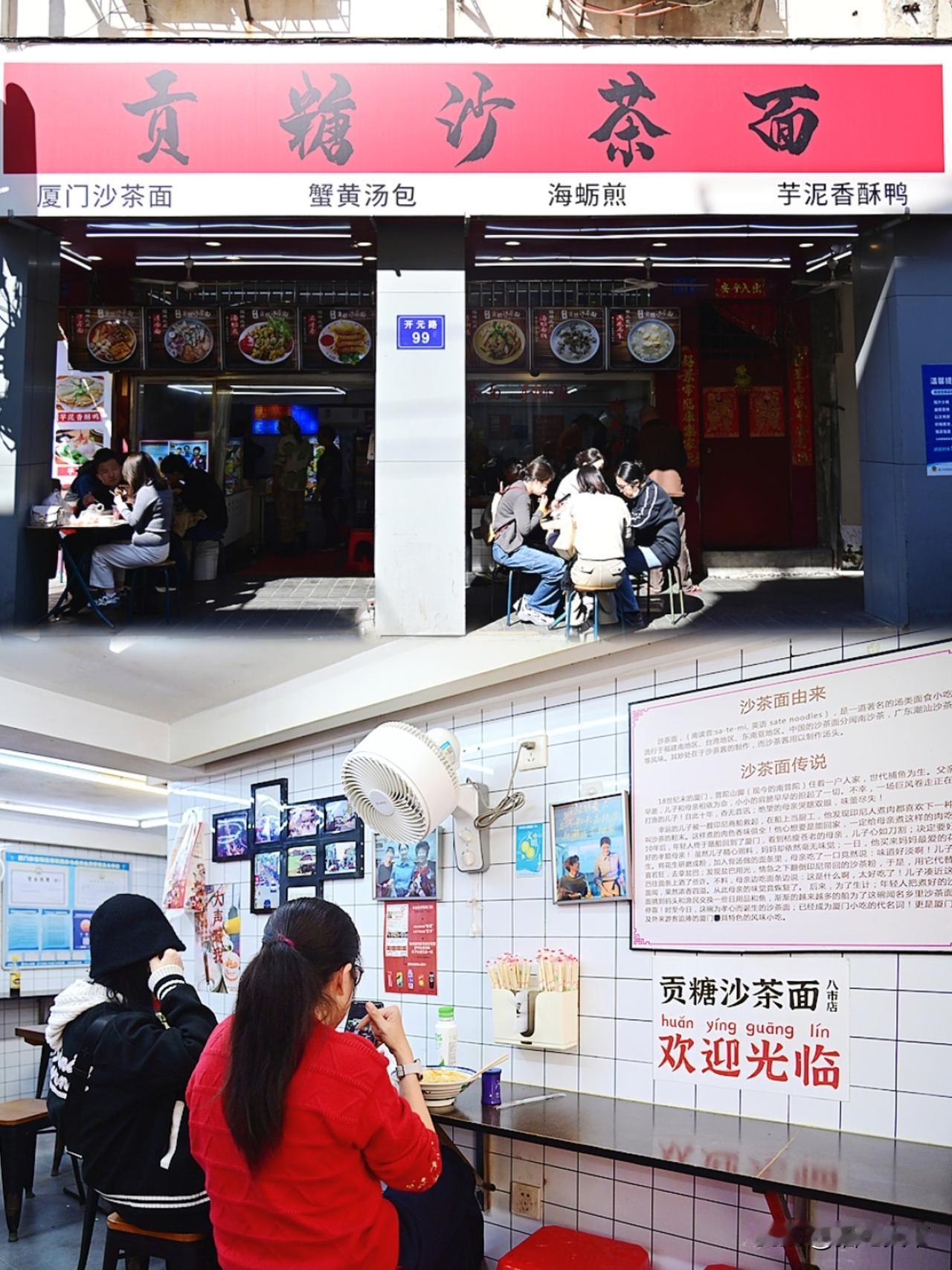 厦门沙茶面特色小吃哪家强,当然是八市正宗地道吃贡糖! [玫瑰]厦门沙茶面大名鼎鼎,厦门八市不可不去,去八市吃沙茶面和特色小吃,本地人推荐贡糖沙茶面!食材新鲜优质品种丰富,工艺坚持传统古法烹制,口味正宗地道秘方传承,价格实在性价比高,本地人和游客都爱去,我今天就约上朋友们去大快朵颐! 🎉位于八市开元路入口旁,大大的招牌很醒目,店内明亮整洁温馨清新,食客满满座无虚席,服务热情亲切大方,用餐体验不错。 ✅ 沙茶面,食客选择想吃的食材,店员大姐将食材和面条在高汤中烫熟后盛入碗中,再倒入秘方熬制的沙茶汤头,一碗热气腾腾香气四溢的沙茶面就做好啦!新鲜饱满的大虾,肉质紧实饱满鲜美清甜!大颗肥美的海蛎,入口即化!肉筋筋道Q弹,小肠柔嫩香浓,面条顺滑,汤汁醇厚鲜香,吃的好满足! ✅清汤面,口味清淡的朋友可以选择这款,食材原汁原味,汤头鲜美清爽! ✅手撕鸡,肉质细嫩娇美多汁,手工撕开没有断骨碎骨吃的放心,秘制酱汁拌的有滋有味,一会就瓜分一空! ✅姜母鸭,肉肉大块份量十足,烹制入味香浓醇厚,一口入魂! ✅海蛎煎,加了好多新鲜肥美的海蛎和蛋,真材实料诚意满满,赞不绝口! ✅五香,光泽油润十分诱人,外皮香酥内馅扎实,回味无穷! ✅芋泥香酥鸭,金灿灿香喷喷,不愧是赵露思都喜欢吃的美食! ✅蟹黄汤包,温润如玉晶莹剔透,皮嫩馅美蟹香迷人,汤汁香醇令人陶醉! ✅烧肉粽,糯米、板栗、五花肉、香菇等多种食材手工制作,厦门人从小吃到大,满满的闽南味! ✅扁食,外皮薄如蝉翼,丰满的内馅清晰可见,柔嫩弹牙满口肉香,汤汁鲜美清新,整碗吃光光! [太阳]大家吃的都好开心好满意,厦门人的美好生活就这么简单!
