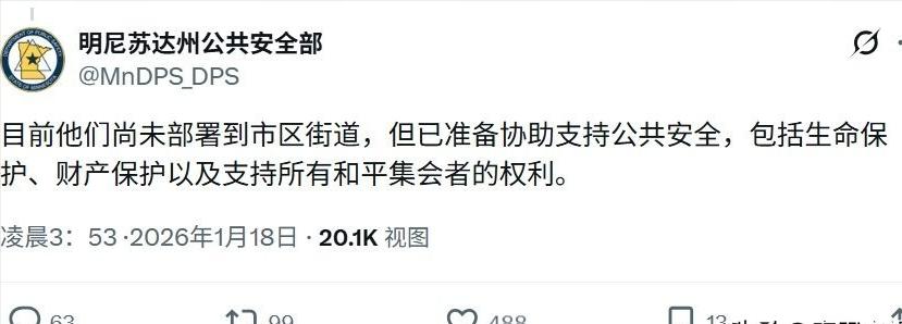 不打伊朗了?美军调转枪口,国民警卫队动员,将开打特朗普御林军 这个冬天的美国明尼苏达州,比零下二十摄氏度的严寒更刺骨的,是街头蔓延的对立与紧张。 当地时间1月17日,州政府宣布动员国民警卫队进入待命状态,不是为了应对外部威胁,而是要直面自家内部的乱局——一边是特朗普派来的联邦执法大军,一边是怒火中烧的抗议民众,还有搅局的极右翼势力,一场多方角力的大戏正在上演。 1月7日,美国移民与海关执法局(ICE)人员在明尼阿波利斯市开展移民执法时,开枪打死了37岁的美国公民蕾恩·妮科尔·古德。 这本是一起涉嫌过度执法的悲剧,却被迅速卷入美国两党的政治漩涡。特朗普一上来就给死者贴了“职业煽动者”的标签,力挺ICE执法,而民主党主政的州政府则拿出影像证据,指责执法人员鲁莽行事,双方各执一词,裂痕瞬间扩大。 特朗普不仅嘴上硬,行动上更强势。他借着当地索马里移民牵涉福利诈骗案的由头,发动了大规模移民执法行动,派了近3000名联邦执法人员进驻该州,这是美国迄今最大规模的同类行动。 司法部还对民主党籍的明尼苏达州州长蒂姆·沃尔兹、明尼阿波利斯市市长等人启动刑事调查,指控他们妨碍联邦执法,政治打压的意味拉满。 联邦政府的强硬态度,彻底点燃了民众的怒火。抗议活动从明尼阿波利斯迅速蔓延,全美数十座城市都响起了反对暴力执法、抵制ICE的声音。 1月17日,明尼阿波利斯的抗议现场更是乱成一团,支持ICE的极右翼人群主动找上门对峙,双方在市政厅附近推搡辱骂、肢体冲突不断。 牵头极右翼人群的杰克·朗,还是特朗普赦免的2021年国会山骚乱参与者,他甚至声称自己在冲突中“遇刺”,靠着防护背心才没事,妥妥的特朗普“御林军”做派。 面对愈演愈烈的局势,州政府也不再退让。州长沃尔兹直接动员了州国民警卫队,虽然目前还没部署到街头,但已明确表态要支持公共安全,保护和平集会者的权利,这相当于和联邦执法力量形成了微妙的对峙。 五角大楼也下令约1500名陆军士兵待命,这些擅长严寒作战的部队随时可能被派往当地,美军这是要把枪口从海外对准本土了。 这场乱局的背后,早已不只是简单的执法争议,而是美国社会深层矛盾的总爆发。移民问题、种族对立、两党恶斗、暴力执法,所有的顽疾都在明尼苏达州集中显现。 特朗普想靠强硬执法巩固基本盘,民主党则要借民众怒火对抗共和党,可夹在中间的普通民众却成了牺牲品——不仅有被枪杀的古德,还有被催泪弹波及、险些窒息的6个月大婴儿,无辜者的伤痛被政客们抛在脑后。 如今的明尼苏达州,就像一个火药桶,稍有不慎就可能引爆更大的冲突。国民警卫队的动员不是结束,只是局势升级的开始。 当一个国家的军队开始准备应对内部民众,当联邦与州政府陷入“调兵遣将”的对峙,所谓的“民主与自由”,在零下二十度的寒风中显得格外苍白。这场撕裂国家的闹剧,还远没有落幕。