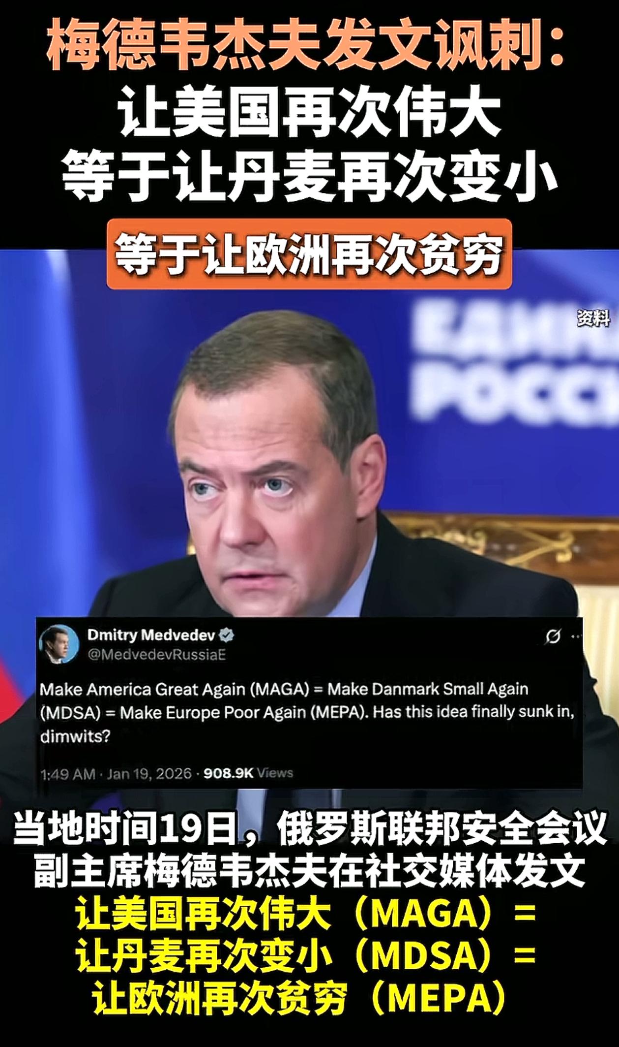 梅德韦杰夫这段对美国强抢格陵兰岛事件的发文讽刺,把阳谋给用到位了! 直接把刀子捅进丹麦和欧洲的心脏,他说,美国强占格陵兰岛的行径,意图让美国再次伟大,等于让丹麦再次变小,等于让欧洲再次贫穷! 这句话讽刺得再直白不过了,俄罗斯现在看热闹不嫌事大,把赤裸裸的事实公之于众,让丹麦和欧洲各国人民自己掂量掂量,民意起来反对的话,欧洲政客为了支持率就必须坚决和美国对着干,如果欧洲各国政客不在意,那么即输了面子又输了里子,只能再次变小变贫穷