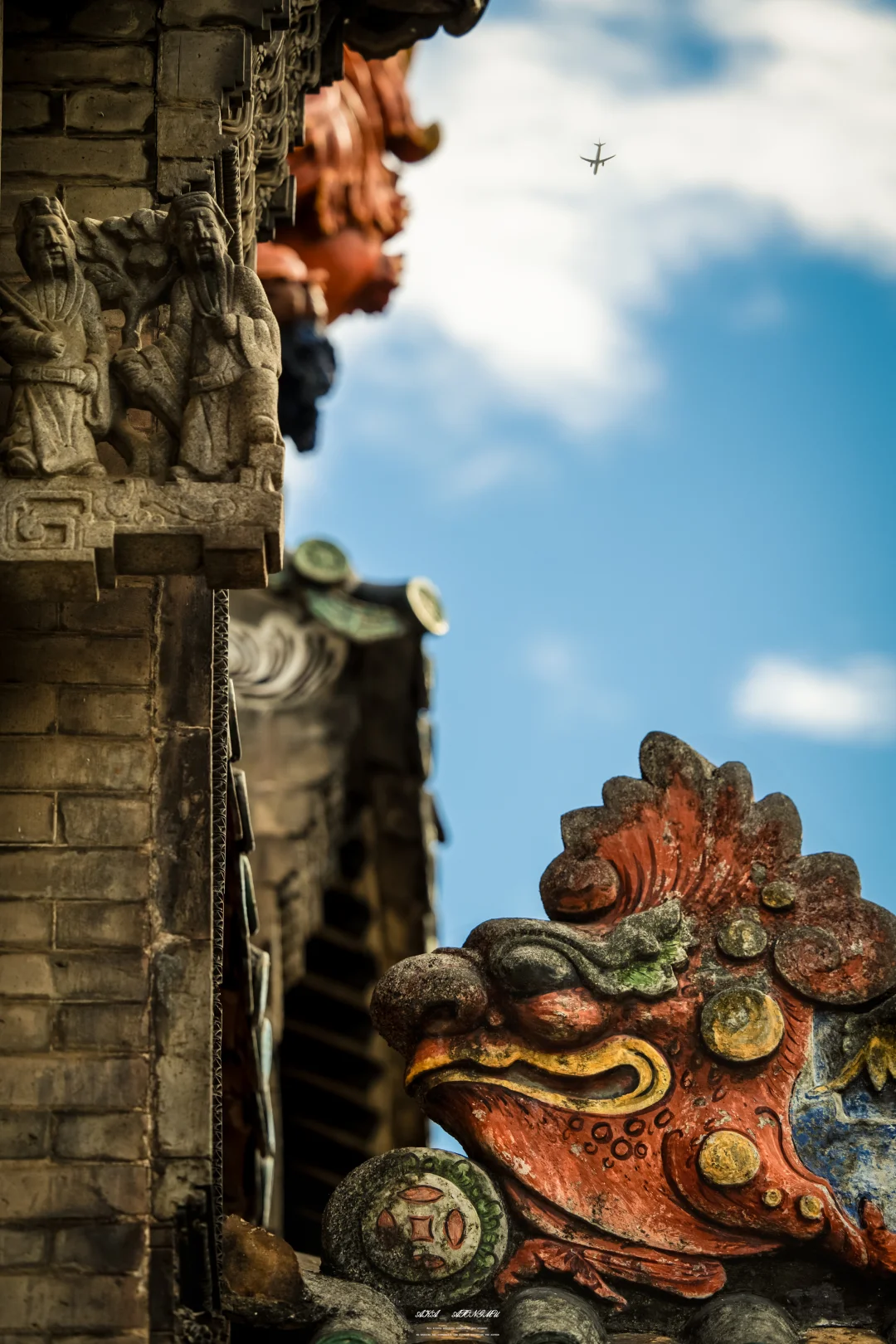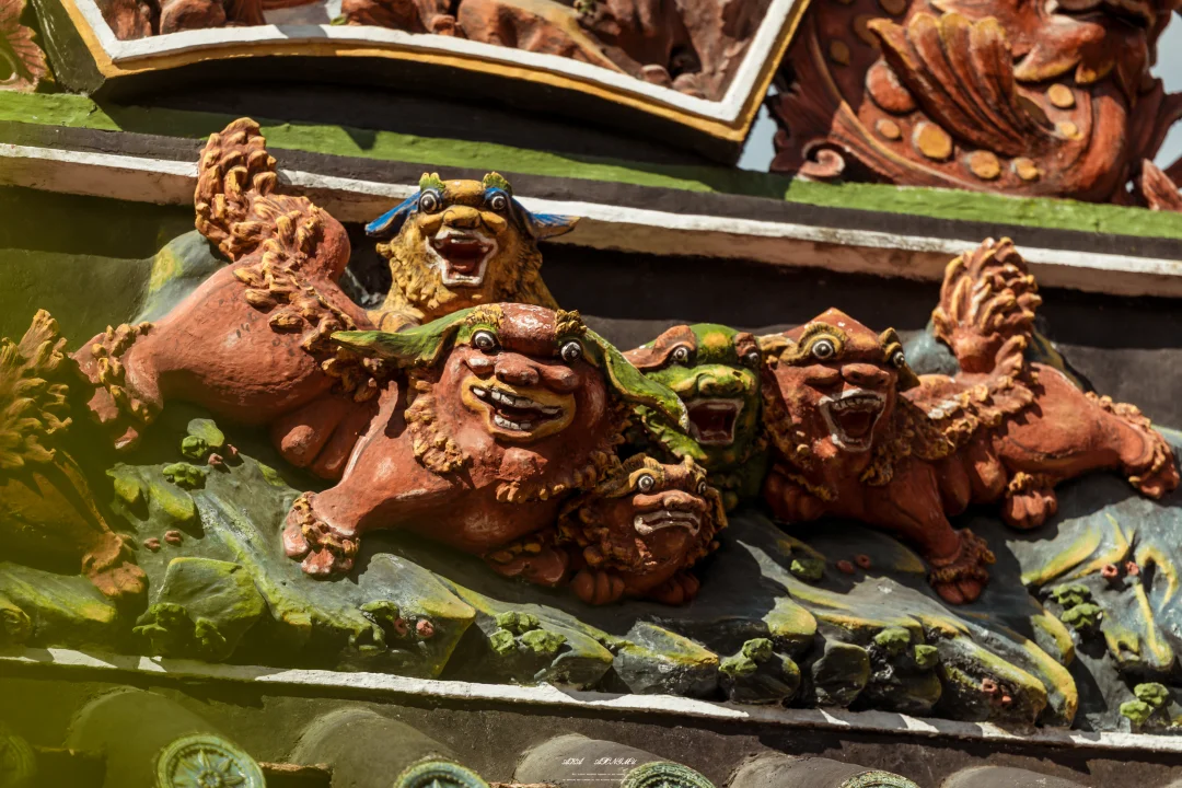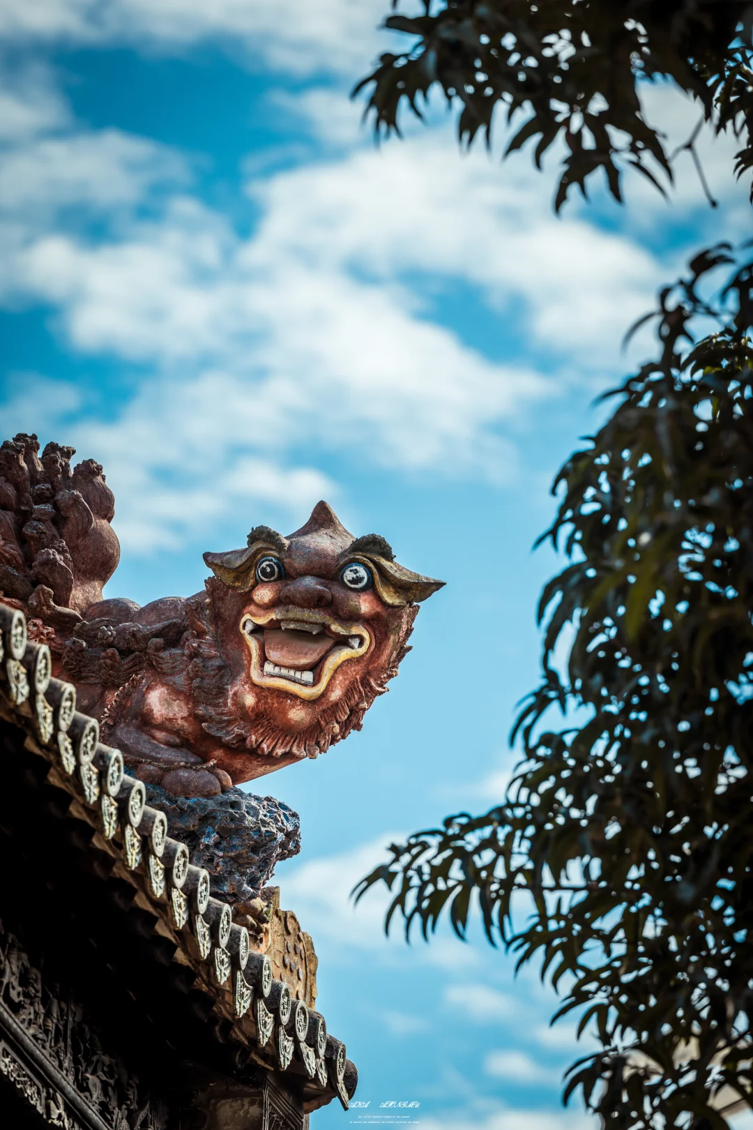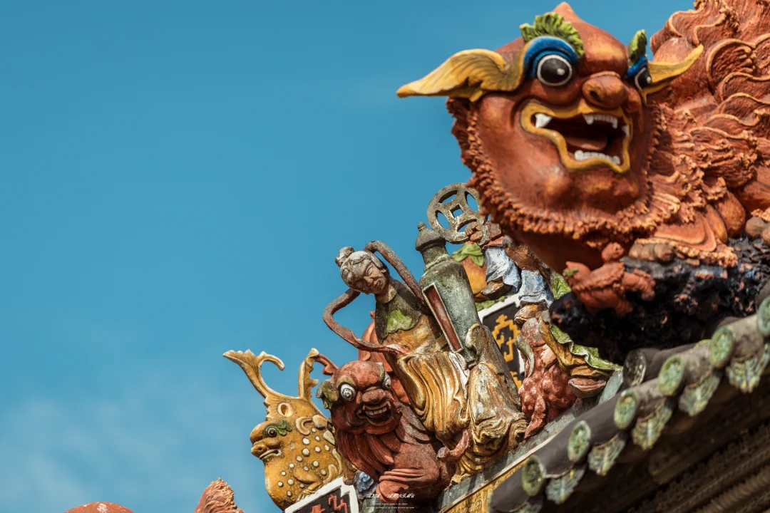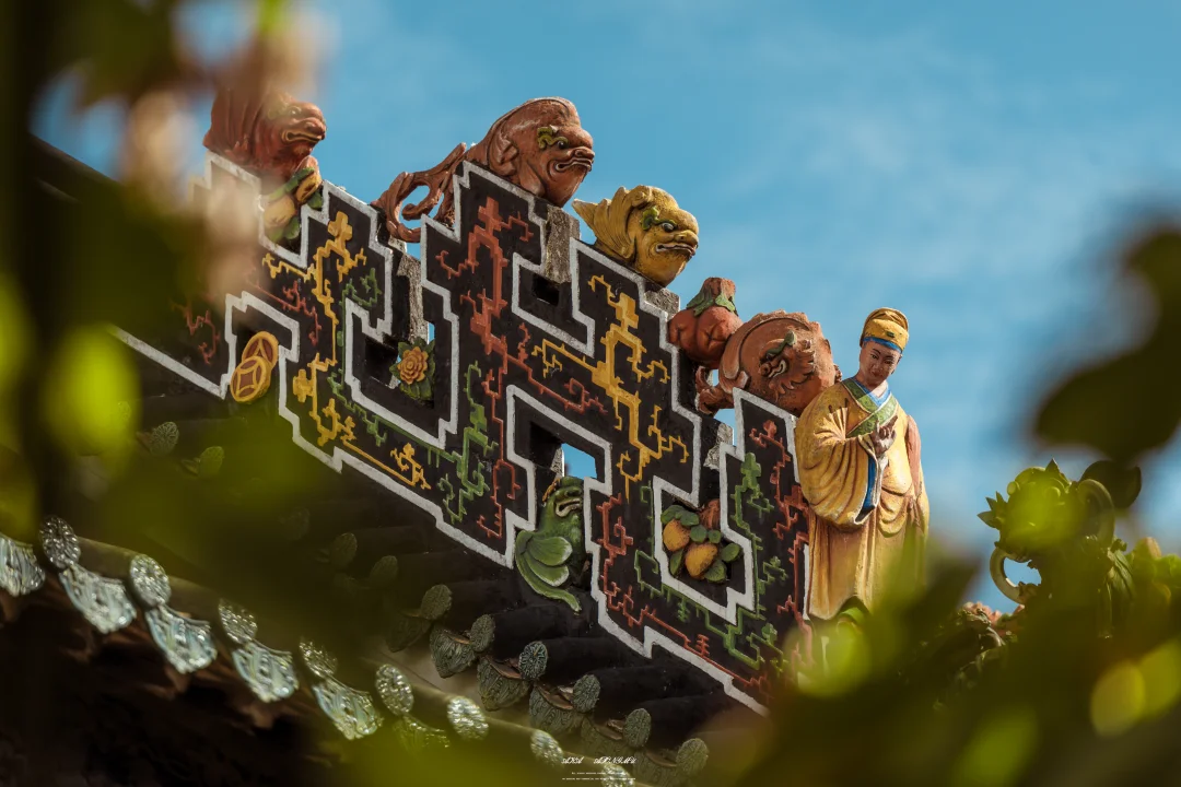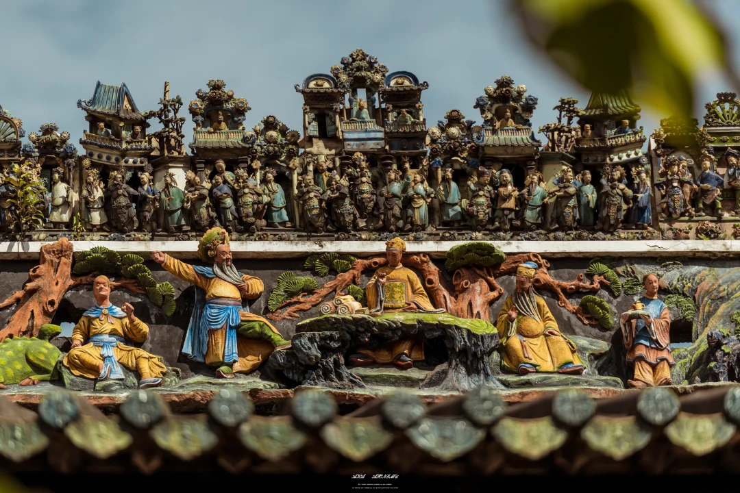 迈过青砖高墙,抬头一瞧,就被屋顶的景致勾住了魂——这青砖灰瓦的岭南建筑里,最惹眼的就是那层层叠叠的彩色花脊,陈家祠的屋顶足足有11条花脊,总长度达165米,花脊上挤着数百个人物和图案,热热闹闹地演着无声的大戏:有粤剧里的经典桥段,有群仙祝寿、加官进爵的吉祥传说,还有牡丹、凤凰、蝙蝠这些寓意富贵的花鸟鱼虫。大门屋脊两端各蹲一只威风凛凛的青色鳌鱼,龙首鱼身,虬尾朝天,藏着“独占鳌头”的好彩头,屋檐垂脊上那六对朱红色独角狮,一米多高,大眼圆睁、张口翘尾,阳光一照,陶塑灰塑的色彩交相辉映,人物动物都像活了过来,让人看得眼花缭乱。