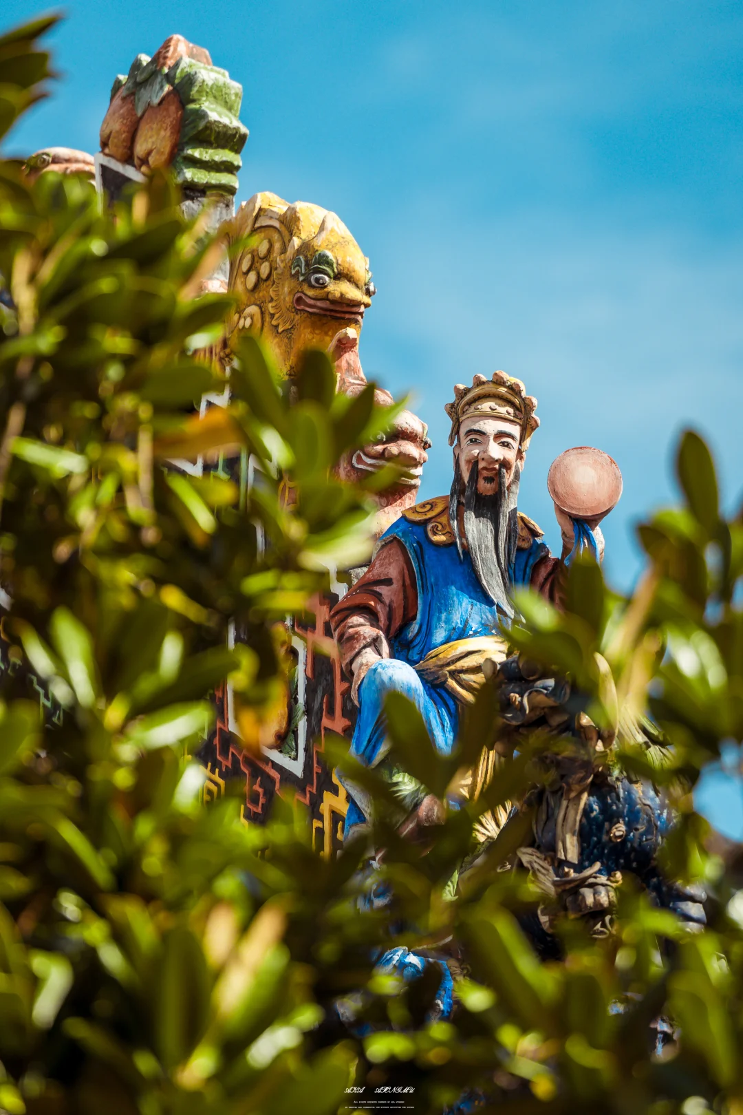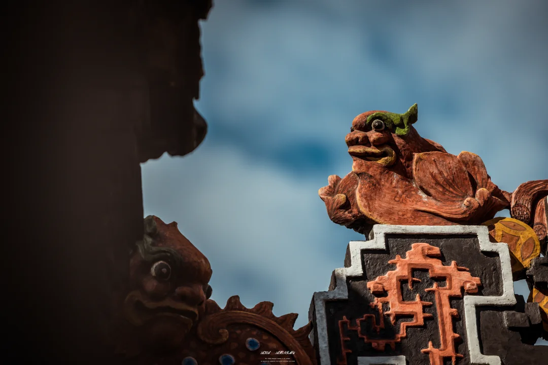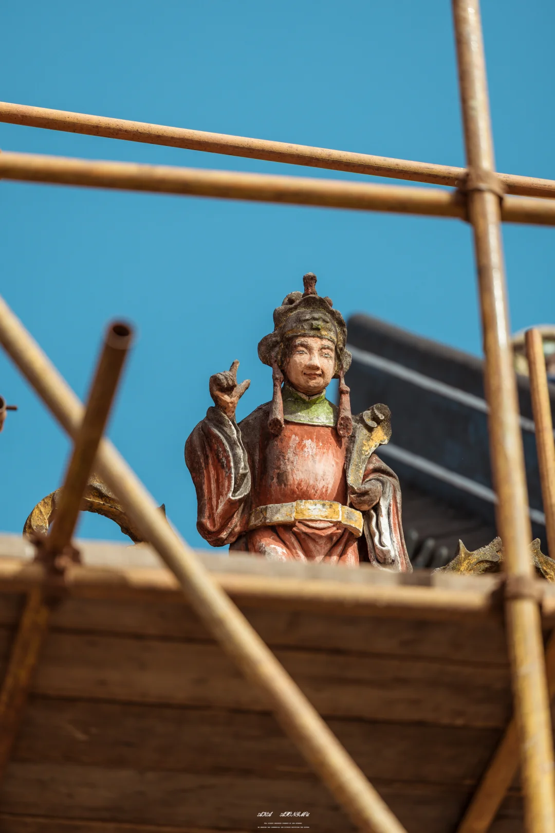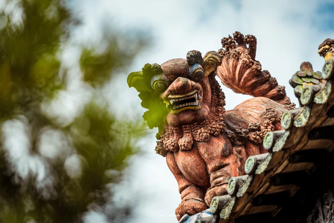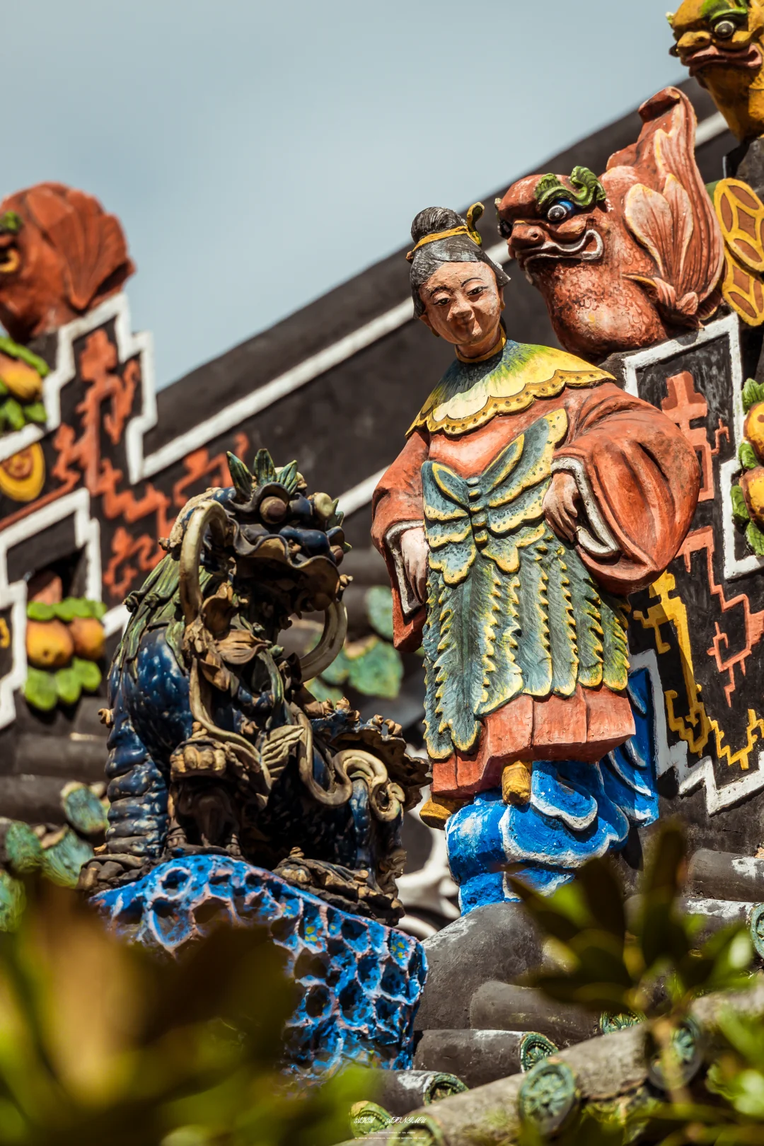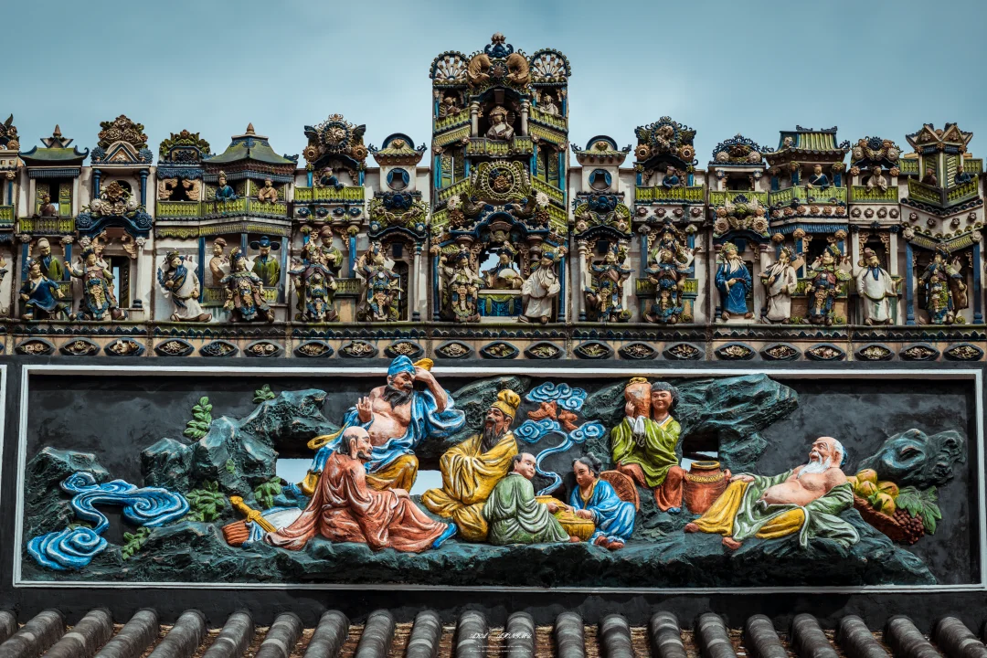迈过青砖高墙,抬头一瞧,就被屋顶的景致勾住了魂——这青砖灰瓦的岭南建筑里,最惹眼的就是那层层叠叠的彩色花脊,陈家祠的屋顶足足有11条花脊,总长度达165米,花脊上挤着数百个人物和图案,热热闹闹地演着无声的大戏:有粤剧里的经典桥段,有群仙祝寿、加官进爵的吉祥传说,还有牡丹、凤凰、蝙蝠这些寓意富贵的花鸟鱼虫。大门屋脊两端各蹲一只威风凛凛的青色鳌鱼,龙首鱼身,虬尾朝天,藏着“独占鳌头”的好彩头,屋檐垂脊上那六对朱红色独角狮,一米多高,大眼圆睁、张口翘尾,阳光一照,陶塑灰塑的色彩交相辉映,人物动物都像活了过来,让人看得眼花缭乱。