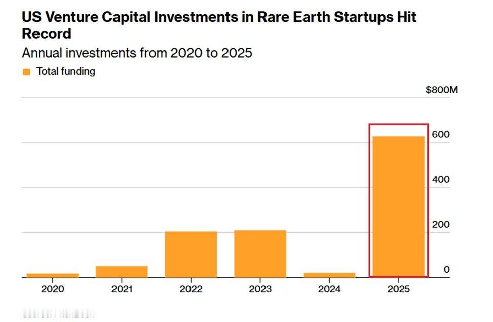 对比一下美国的资本效率。他们对稀土相关行业的投资在迅速飙升。 去年美国初创企业吸