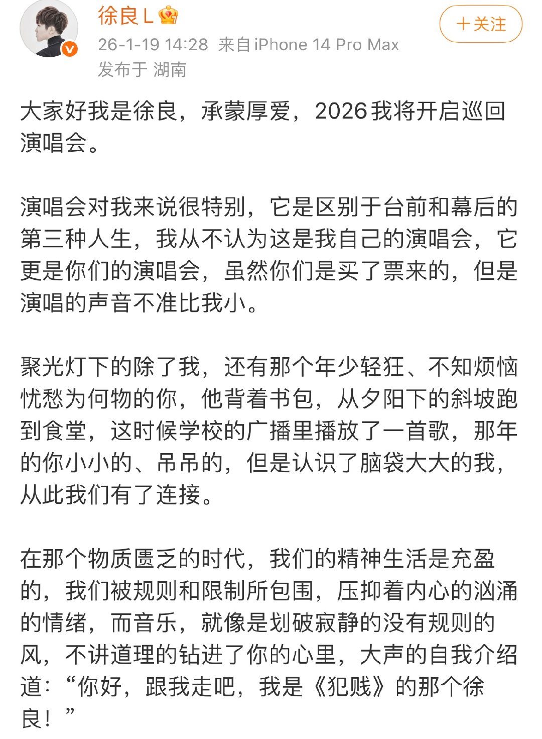 徐良官宣2026巡演徐良开演唱会徐良官宣2026巡演,期待