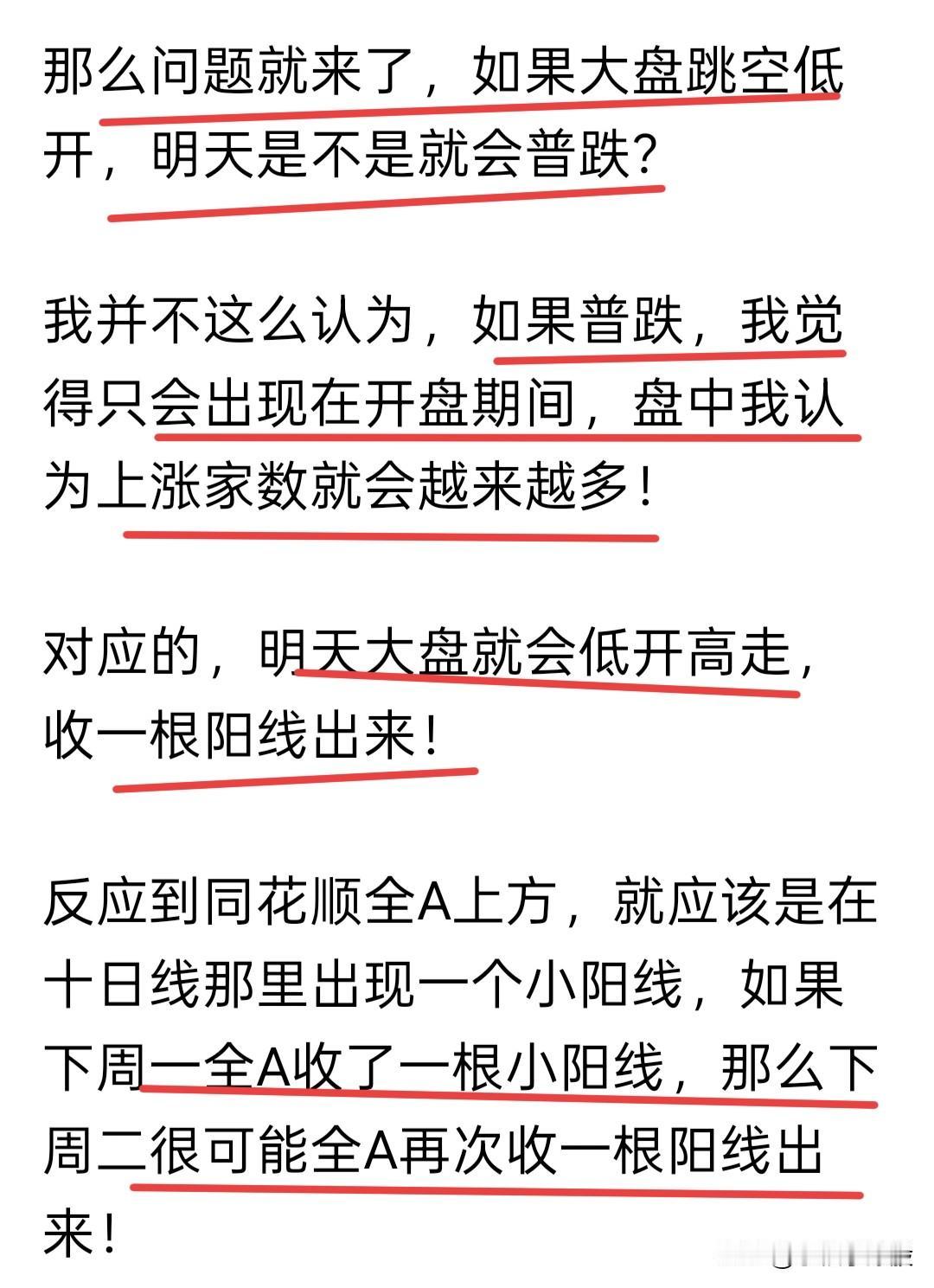 收盘很多人又迷茫了,我一看刷我主页的人超级多,不好意思,久等了,和闺蜜打副本,尾盘入手完时间不够了,也就没写! 写与不写都不重要,因为写了也是写大盘站稳十日线不看空,但是还要继续滚动操作,没什么新颖感! 如果今天大盘没有低开高走,出现小普涨,你们就能看到一些人的嘴脸了,有多恐怖了,虽然我说4000家上涨,目前3500多家,虽有偏差,但是不大! 今天唯一的缺点就是全A收的阳线有点大,这个不太好,因为离2055点这个压力位太近了!明天全A很可能上攻不破压力位就要回落下来了! 所以明天的对应策略,应该就是冲高继续扔!等待全A收一根红色十字星阳线,这样的话周三就还可以上攻!周三上攻完,大概率就会开始回调了! 现在的思路不好写,因为大家的能力参差不齐,这种震荡行情本身就很难操作,一旦影响了有些人,他们就会无脑攻击,没什么意义!参考你的还得喷你!所以更新也不会那么频繁,因为不值得! 从今天的主流玩法来看,依旧是十日线趋势,很单一,也就是很傻瓜式的模式,很多人不愿意再去那种让人心惊肉跳的个股里冒险了,都在躺趋势! 业绩报现在陆续开始披露了,又到了炒作业绩的时候了吧! 一万个人有一万种思路,所以我的思路仅供参考,不要盲目跟随! 终于下雪了,下的好大的雪,那么洁白与无暇……