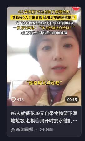 “脸都不要了!”上海,一行7人走进一家小饭馆,老板本以为来了大客户,结果7个人加在一起才花了19块钱,做了一个半小时留下了一地的垃圾,老板见状没说什么,只是让他们把垃圾带走,结果其中一人却指责老板没格局。 乍一看,对方的确掏了腰包,毕竟19块钱也是真金白银。但细品这番操作你就会发现不对劲:那两碗最廉价的清汤更像是一张“入场门票”,进门后他们便大摇大摆地掏出外带食材,毫不客气地征用了店里的碗碟、醋瓶和辣椒酱,给自己的食物疯狂加料。 至于那两碗汤?压根没怎么动,纯粹就是摆在桌上充门面的道具。说穿了,这就是把私人商铺当成了免费的公共食堂。霸占着黄金饭点的餐位,蹭着水电、纸巾和空调,享用着自己带来的大餐。这一坐就是足足一个半小时,餐厅的翻台率直接被这波操作归零。 临走之际,现场一片狼藉,废纸团、食物残渣散落得到处都是,连个下脚的地方都没有。店主硬是忍耐了一个半钟头没作声,此刻看着满地狼藉实在忍无可忍,便礼貌地说了句:"麻烦把垃圾带走吧。" 那位带头的大哥瞬间变脸,摆出一副受到冒犯的姿态,当场怒斥:"你这人怎么做生意的?一点格局都没有!"话音未落便拂袖而去,只留下店主一人对着满地垃圾呆若木鸡。 事后老板越想越觉得憋屈,他坦言,倘若对方事先打个招呼,自己绝不会斤斤计较。但对方肆意挥霍了店里的资源,留下一地烂摊子,最后反倒倒打一耙嫌弃他格局太小,这种逻辑实在让他无法接受。 有人给算了笔细账:店铺提供了场地、水电、调味品、餐具耗材,还得搭上人工清洁成本,哪一样不需要真金白银?区区19块钱甚至不够点一个热炒,难道还指望商家去做活菩萨? 还有人一针见血地指出:"真要论格局,老板允许你们自带食物进店,就已经够大度了。现在好多店明文规定不许外带,就是防着这种'精致白嫖'。" 更有网友揭露了这类人的心态:"他们不是不懂规矩,是故意把自己的方便建立在别人的麻烦之上。吃完了一句'格局'就想堵住老板的嘴,这叫道德绑架。" 你支付19块钱,买断的仅是那两碗汤的价值,而非包场式的尊贵服务。霸占座位吃外食,消耗着商家的调料,末了还要因被要求带走垃圾而嘲讽店家“没格局”,这道理走到哪都讲不通。 真正的格局,是消费者深谙经营者之不易,心怀体谅;是商家于能力所及之处,倾己所能,为消费者提供便利,彼此理解,共筑和谐之境。人际交往,应以相互尊重为底线。它绝非一方对另一方的单方面勒索,迫使对方进行无节制的付出。唯有彼此敬重,方能构建健康、和谐的关系。 这场闹剧也给所有小本经营者敲响了警钟:该立规矩时切莫心慈手软。无论是明确标示“谢绝自带酒水食物”,还是设定“店内消费低XX元不提供堂食座位”,把丑话说在前面,总好过事后给自己添堵。