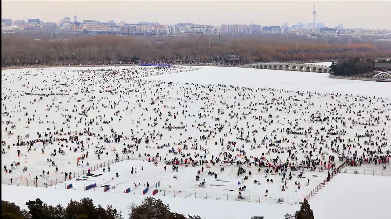 有人能看出这是哪里吗?万人在冰冻的湖面滑雪。 玩雪滑雪