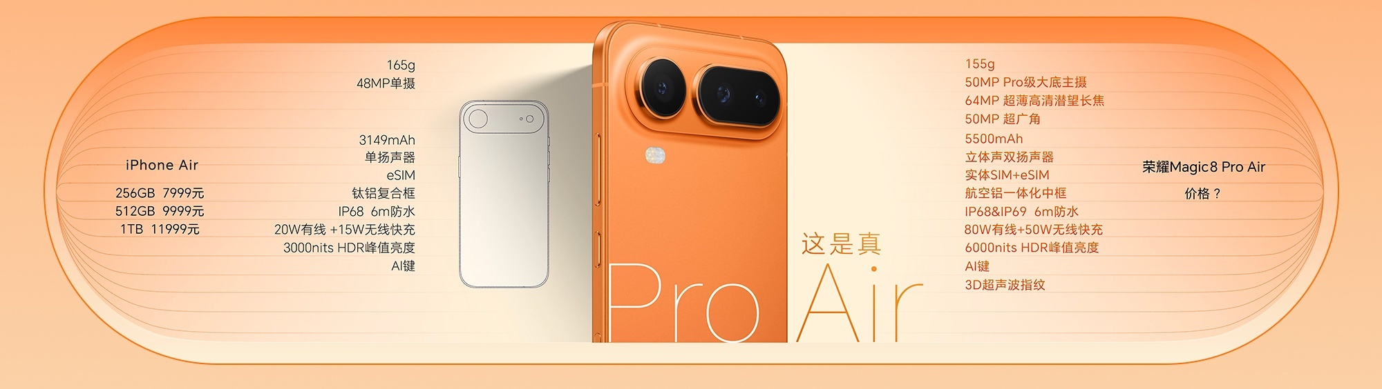 荣耀Magic8 Pro Air 轻橙 仙紫 羽白 影黑四色6.1mm机身 155g体重6.31英寸小直屏 好看还轻薄 难得主摄是Pro一样的5000万像素1/1.3英寸传感器 F1.6超大光圈也是行业首个超薄高清潜望长焦加持3.2倍光学变焦 5000万像素超广角AI变焦阵列闪光灯 5灯阵列式结构5500mAh青海湖电池 荣耀蝉翼架构 航空铝一体化中框巨犀玻璃 IP68&IP69双重防尘防水耀绿洲护眼屏 6000nit峰值亮度3D超声波指纹 立体声双扬声器 支持eSIM与实体SIM的四卡双待80W有线+50W无线双快充 天玑9500旗舰芯 4999元起