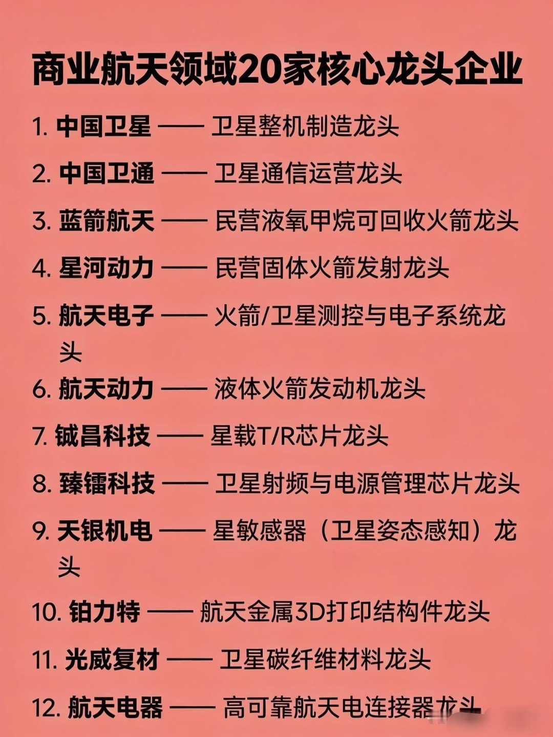 商业航天领域20家核心龙头企业:中国卫星——卫星整机制造龙头中国卫通——卫星通信运营龙头蓝箭航天——民营液氧甲烷可回收火箭龙头星河动力——民营固体火箭发射龙头航天电子——火箭/卫星测控与电子系统龙头航天动力——液体火箭发动机龙头铖昌科技——星载T/R芯片龙头臻镭科技——卫星射频与电源管理芯片龙头天银机电——星敏感器(卫星姿态感知)龙头铂力特——航天金属3D打印结构件龙头光威复材——卫星碳纤维材料龙头航天电器——高可靠航天电连接器龙头航天宏图——遥感卫星数据应用与星座建设龙头银河航天——低轨宽带通信卫星龙头中科宇航——混合所有制中型液体火箭龙头天兵科技——中型液体可回收火箭技术龙头长光卫星——高分辨率遥感星座(吉林一号)龙头海格通信——卫星通信终端设备龙头华力创通——手机直连卫星基带芯片龙头东方空间——大推力固体火箭龙头