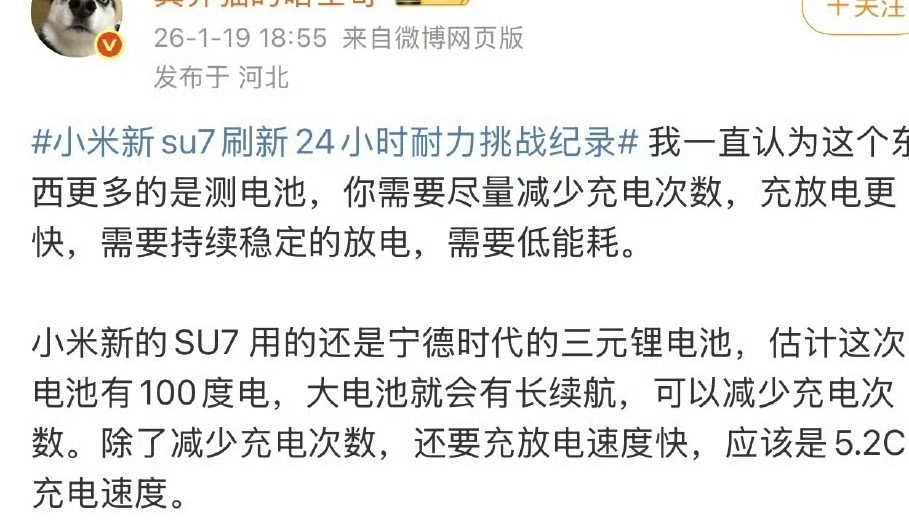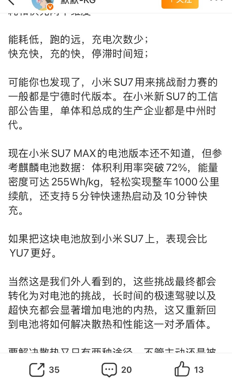 抽象的电池宣发灾难文案新SU7又跑了200多时速几千公里的测试,这个优秀的成绩和电池确实有关系,但不是唯一,说实话,这里换上其他公司的同规格电芯,都能满足要求。新SU7的M版搭载宁德三元电芯,能量密度225Wh/Kg左右,正负极,隔膜,电解液等材料性能参数之前讲过,延续了Ultar的技术方案,具体可以参考之前微博,就不多说了。这个成绩非常棒,也有很多奇怪的人开始夸这个成绩,但就是不夸小米,全部都是刻意的放大了电池的作用。我猜测可能是厂家投放,也可能是因为用了同一家公司的电池,夸这个就等于夸那个。如果真按照哈士奇笨狗的说法,那么如果这快电池换成他天天吹的那几台车的电池,可惜,将会根本无法满足要求,8,9增程用的是133.8Ah电芯,实测容量137.3Ah左右,电芯能量密度255Wh/Kg,纯电用的158Ah,实测容量160Ah左右,能量密度258Wh/Kg,都比小米更高,也就是说,89车型其正极材料并没有采用小米电芯上如此多的改性手段(具体成分如正负极粉体压密粒径隔膜等付款800可以向我购买),且系统成组率72%(纯电)。小米新SU7整包系统密度152Wh/Kg,成组率68%,明显散热等组件更多。也就是说,可以大致推测,电芯和PACK基本上都没有小米的成本高,这个从充电倍率上也能看的出来,也间接说明了为什么789都没有小米充放电性能好(加速极速指标)。再说回极速对三电,充电倍率不说了,放电倍率除开加速时段,基本不超过1.5C放电,说实话,对电池的要求真不算太高,更多的是电机散热,轴承动平衡,电机电控高转速工况下的稳定性,比如高频损耗,反电动势控制等等。都比电池要难搞的多。最后再说,这种不知道是不是电池厂家的投放文案,宣发无可厚非,但是能不能至少保持一个最基本的数据准确性?厂家竟然能放纵乱编参数指标,也是抽象。比如下图,瞎猜电芯密度255,甚至还弄了个72成组,哪怕算一下系统能量密度(不会算?),也会发现和工信部数据对不上啊!哈士奇就更别说了,瞎编乱造习惯了。说实话,如果这真的是电池厂家的投放,宣发可以开除了,长期标榜自身零失误,结果宣发全是乱来的灾难现场,根本不知道自家不同电池的侧重点和优势,靠瞎编乱造来吹嘘赢的口号,确实对不起这优秀的产品质量。厂长说电池小米新SU7刷新24小时耐力挑战纪录