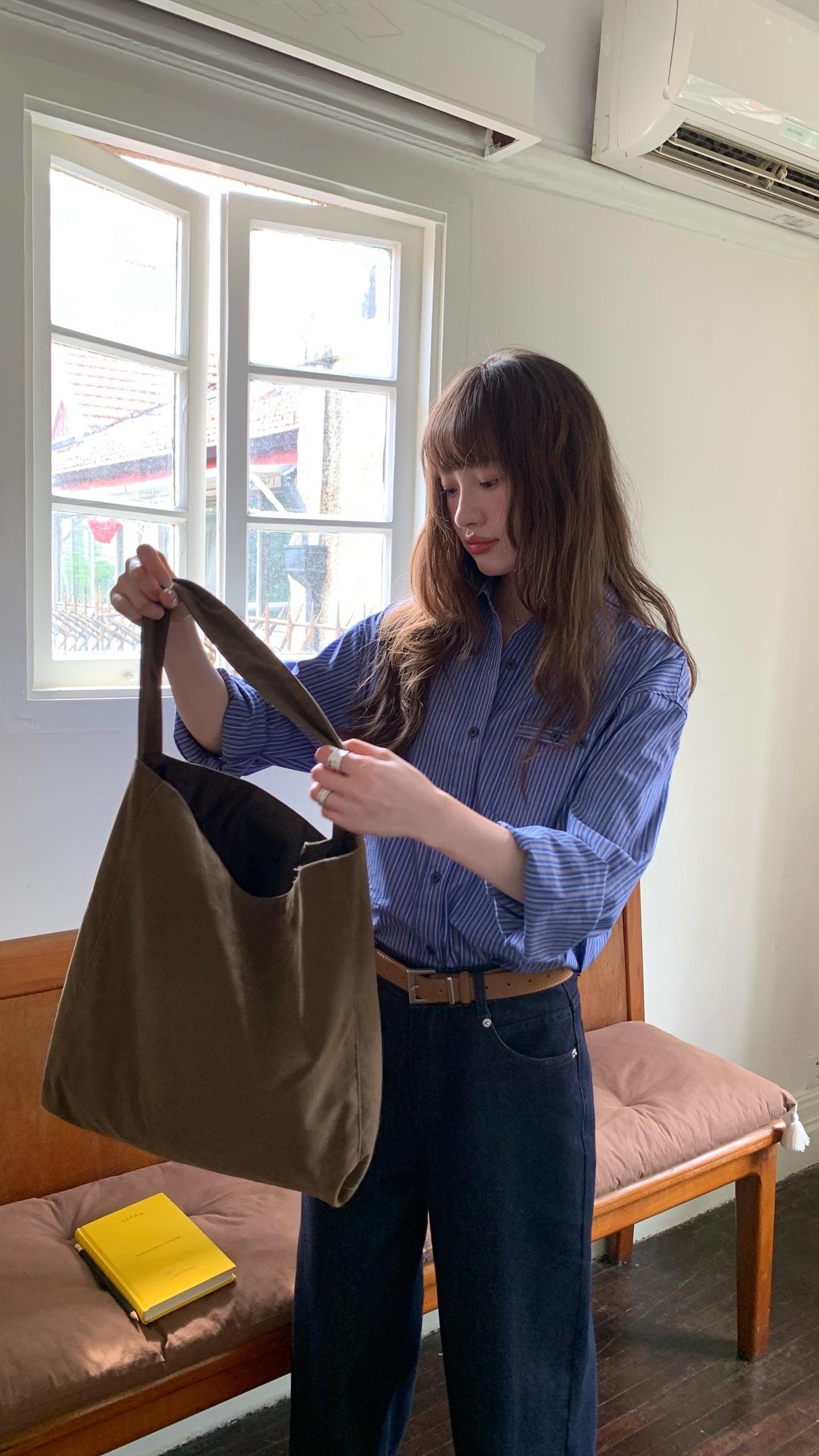 淡紫衬衫揉着温柔的春日氛围,在户外的碎石地面旁闲坐,玫红单鞋撞出点睛的甜酷,让慵