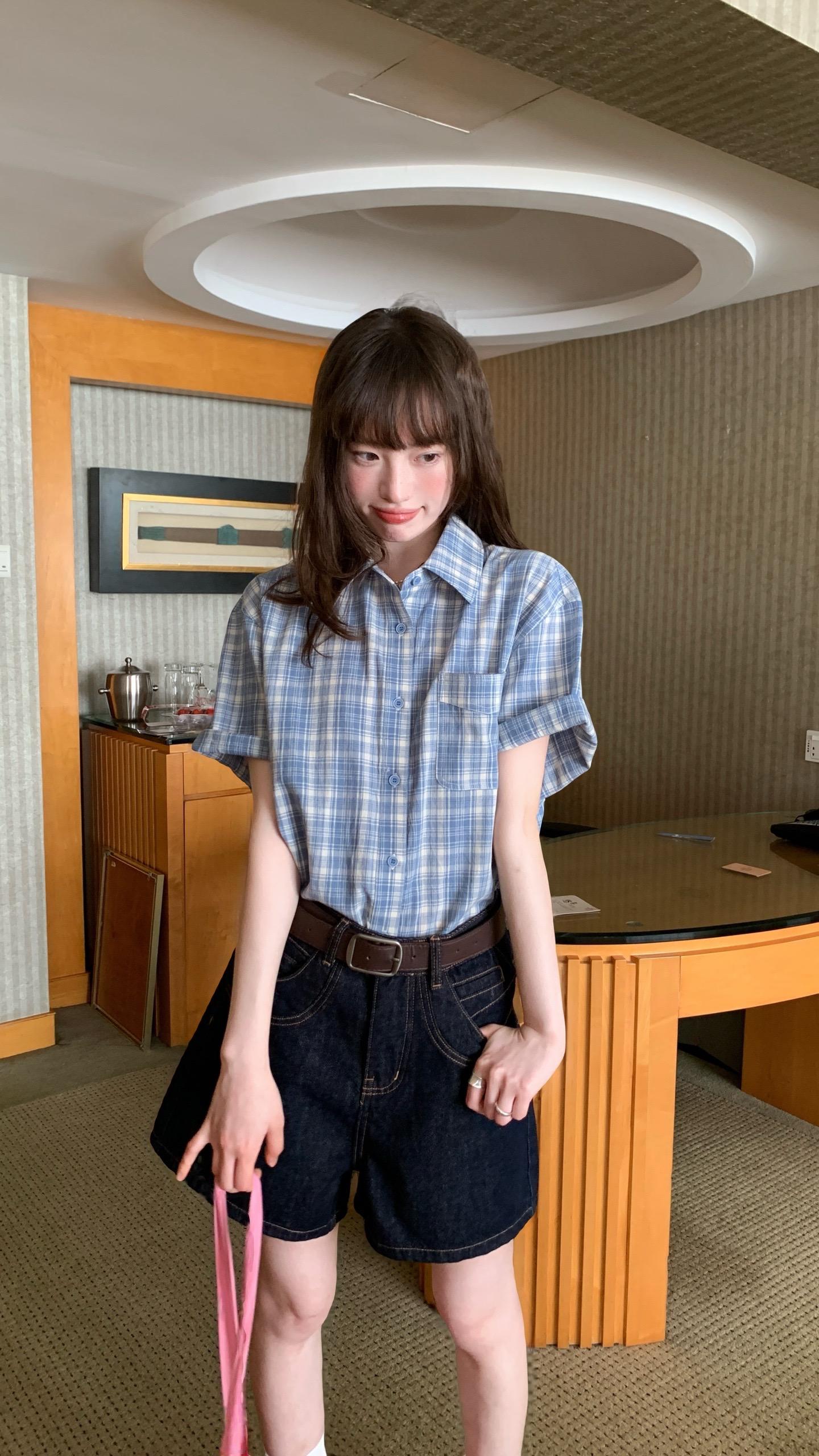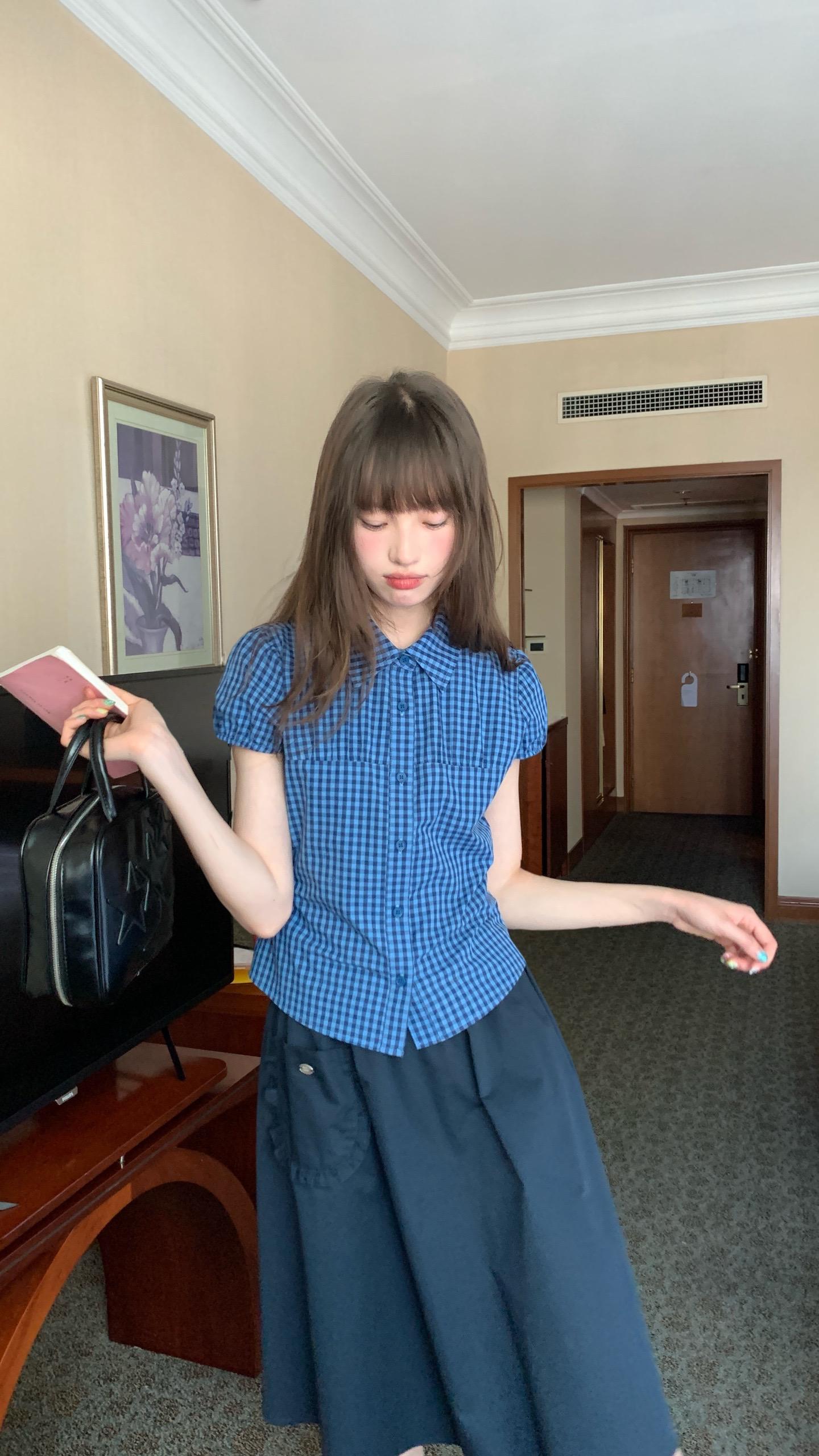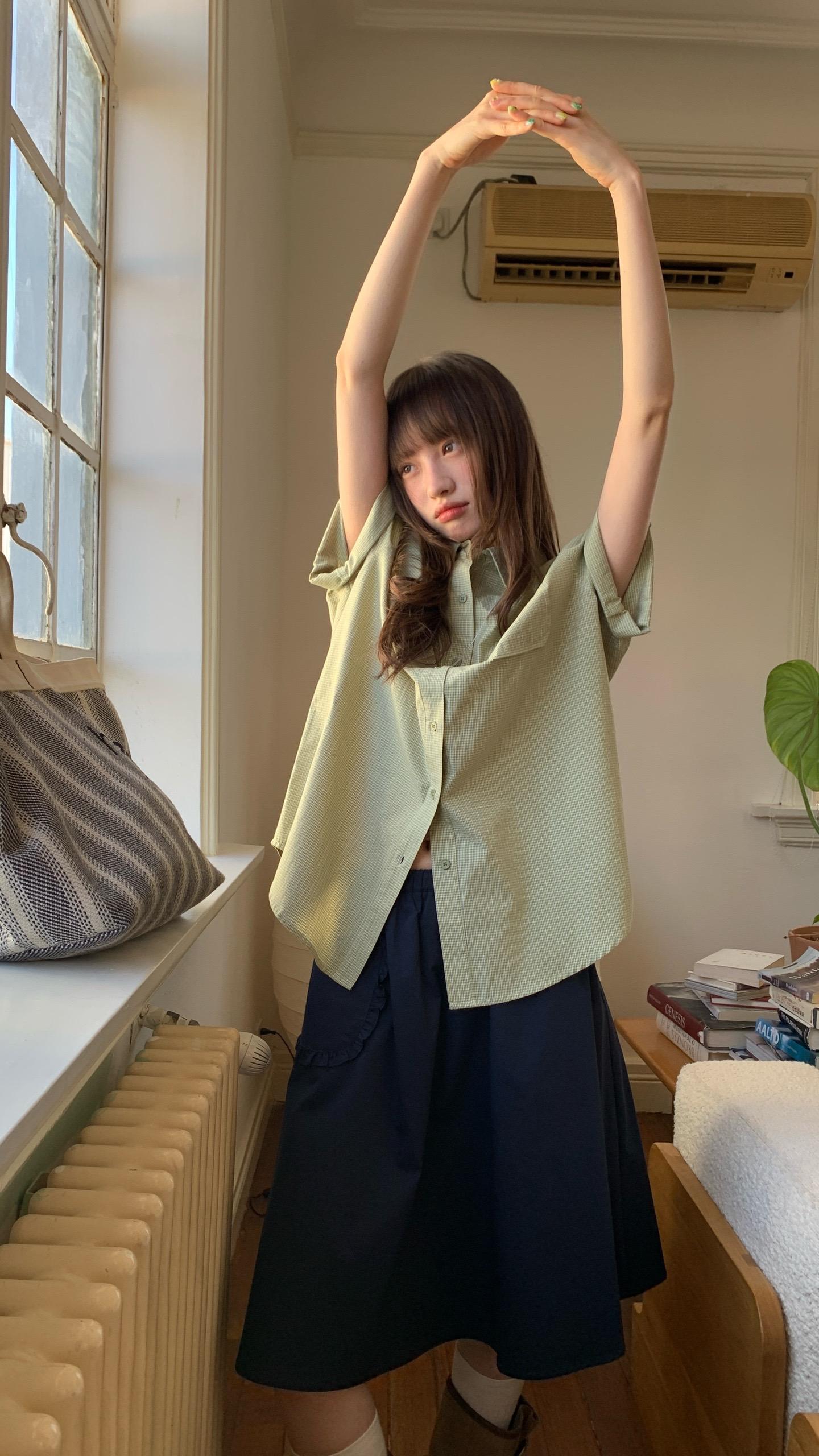 春日里花影摇曳,有人倚于门边,那景致美得如诗如画。印花衬衫搭配格纹短裙,尽显都市