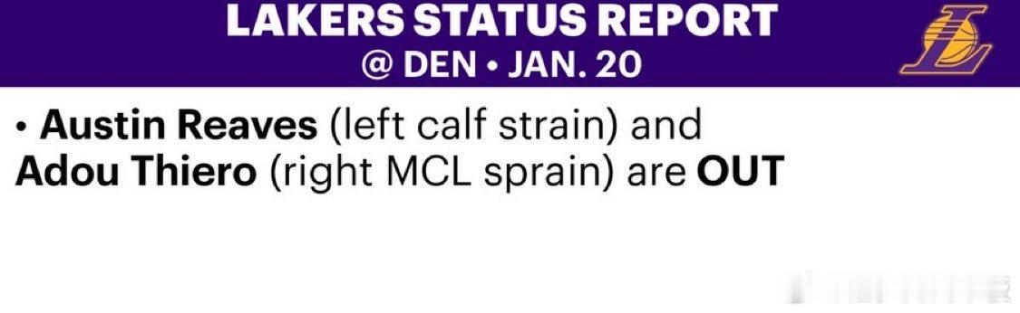简洁的伤病报告!明天对阵掘金:里夫斯、迪耶罗缺阵,其他球员均正常出战 湖人vs掘金