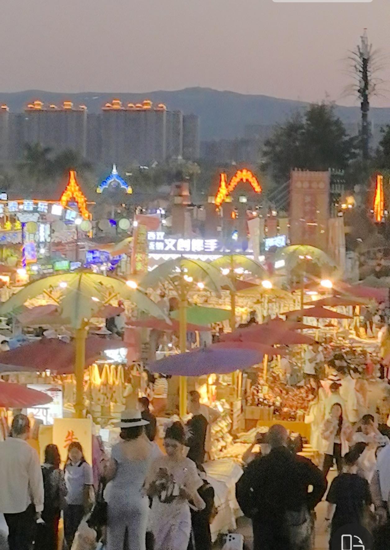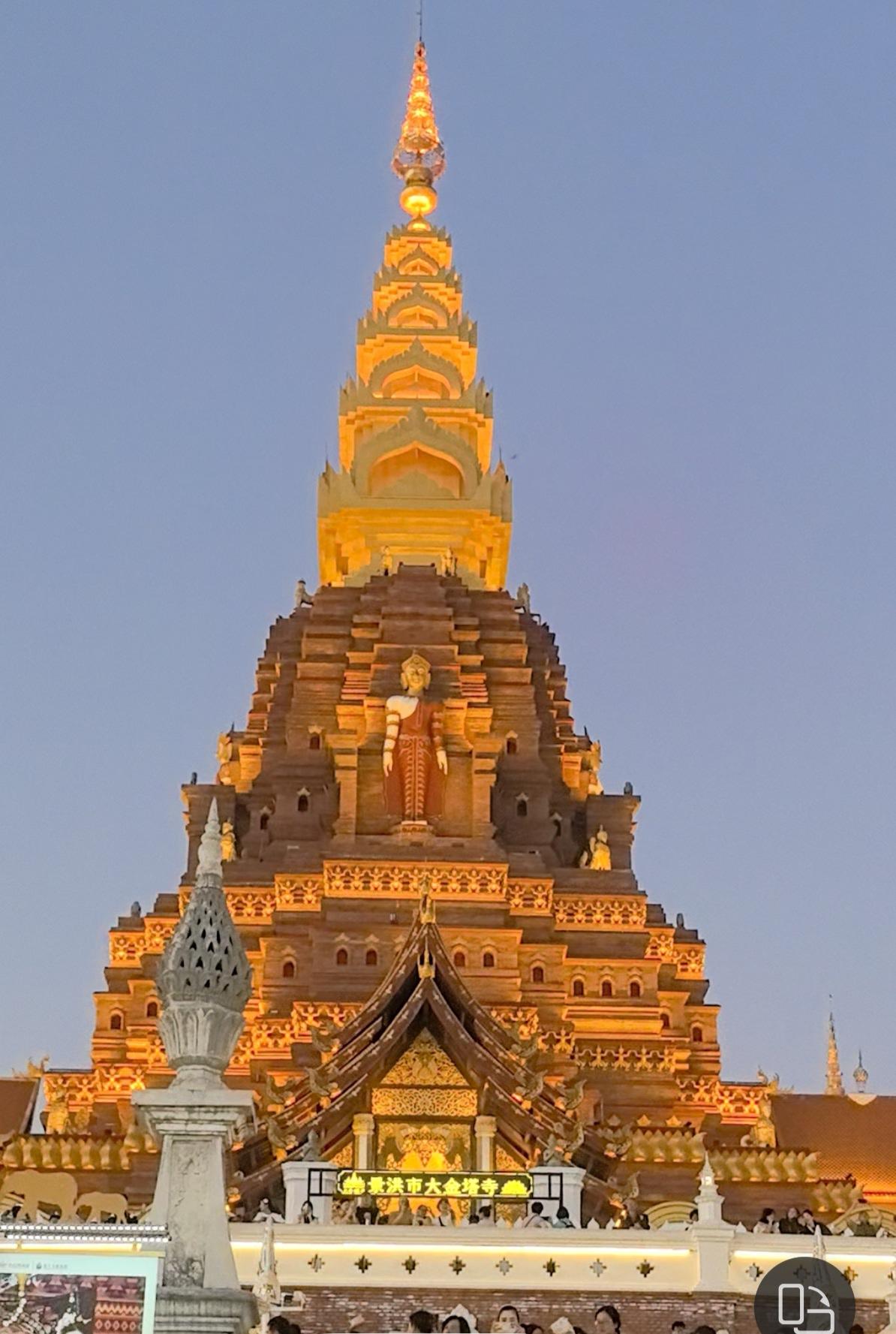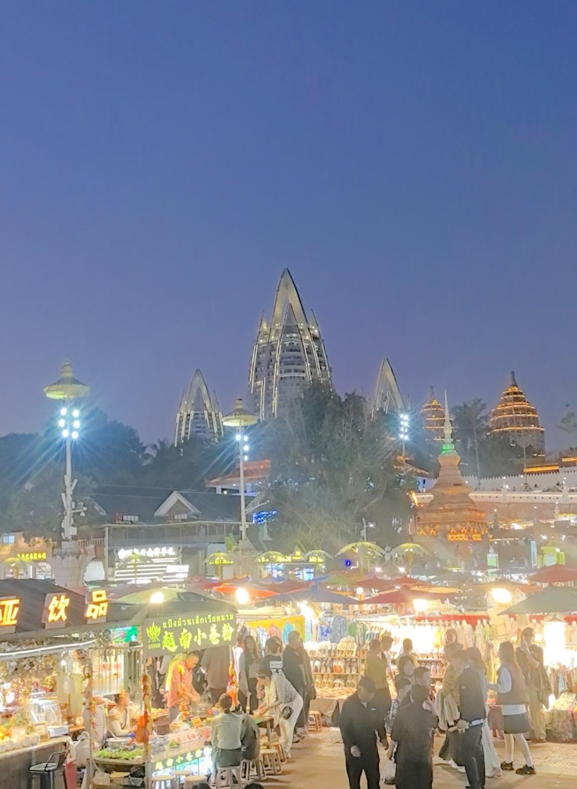到西双版纳啦,感受到了什么是旅游城市 昨天,我们从普洱出发,到了此行最重要的目的地一一西双版纳。 离开普洱,高速公路两旁边的植备越来越茂盛,明显的热带地区特征。到了西双版纳,我们就迫不及待地换上了夏天的衣服,昨天最高温度达28度。 在西双版纳,我们选择住酒店。由于是旅游旺季,现在的酒店很贵还很紧张。我们选择了一家在曼听公园附近的酒店,345元/晚,含双早,位置不错,交通方便,也很安静,服务员热情。下午,我们在酒店休息,把衣服洗了。然后打车去了告庄西双景,先去大金塔参观,金塔宏伟壮观,在太阳照射下,熠熠生辉。 从大金塔出来,就去逛星光夜市,感受一下这里的烟火气,顺便解决晚餐。星光夜市就在大金塔旁边,规模很大很热闹,游人如织。各种卖吃的,卖各种小商品的,唱歌的,画画的,开直播的…我们品尝了当地名小吃,菠萝饭和舂鸡脚,味道不错,就是太贵,菠萝饭15元/份,舂鸡脚29.9元/份。后来我们还买了牛肉干和冰淇淋,都不便宜。看来,这里的生活成本应该不低。夜晚的星光夜市在彩色灯光的烘托下,如梦如幻,让人沉醉其中,星光夜市美如其名。 走在西双版纳的大街小巷,到处都是做旅游的。在这里,让我真正感受到了,什么是真正的旅游城市。也说明,西双版纳作为著名的旅行圣地,是有其独特魅力的。