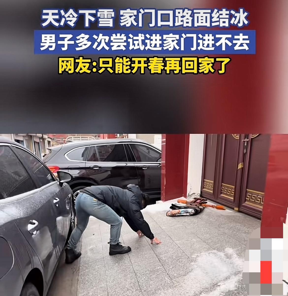 男子下班手持酱肘子,为何在家门口连摔八次爬不起来? “哎哟喂!这地咋跟抹了油似的!”清晨,在山东,一男子拎着酱肘子刚走到单元门口斜坡,脚下一滑,整个人直接摔了个四仰八叉,酱肘子“嗖”地一下飞出去老远。 这冻雨一下,山东好多地方的路面都结了厚厚一层冰,跟镜子似的,走上去那叫一个步步惊心。男子爬起来想接着走,结果刚迈步,又“啪叽”一声摔了,这次摔得更狠,屁股都快摔成两瓣了。他不服气,想着换个姿势,居然开始“匍匐前进”,可这冰面太滑,他就像条搁浅的鱼,怎么扑腾都起不来。 男子急中生智,从兜里掏出纸巾,垫在手掌下想增加点摩擦力,结果刚一用力,纸巾“嚓”一下就碎了,他还是没能站起来。这时候,邻居小李下班回来,看到这场景,忍不住笑出声:“哥,你这是练啥绝世武功呢?”说完,小李想上前帮忙,结果刚走到男子身边,脚下一滑,也摔了个大马趴,两人你看我,我看你,都哭笑不得。 周围围了不少人,大家都想帮忙,可这冰面太滑,谁都不敢轻易上前。就在这时,物业大爷扛着铁锹,拎着融雪盐匆匆赶来。大爷一到,先撒了把融雪盐,然后拿着铁锹“咔咔”铲冰,不一会儿,冰面就被铲出了一条小路。男子在小李和物业大爷的搀扶下,终于进了单元门。 大家对这事儿有啥想法,都来评论区唠唠,一起分享分享! [免责声明]文章的时间、过程、图片均来自于网络,文章旨在传播正能量,均无低俗等不良引导,请观众理性看待本事件,切勿留下主观臆断的恶意评论,互联网不是法外之地。本文如若真实性存在争议、事件版权或图片侵权问题,请及时联系作者,我们将予以删除。