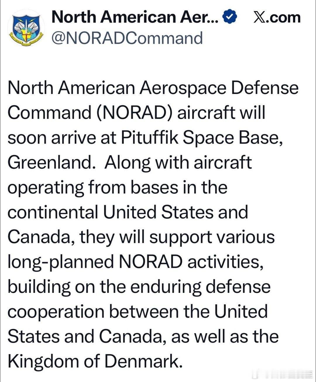 美军北方航空航天防御司令部官宣:即将派飞机去格陵兰,是计划中的、常规行动,与加拿大、丹麦以前都协调过,这次也都通知到了莫慌