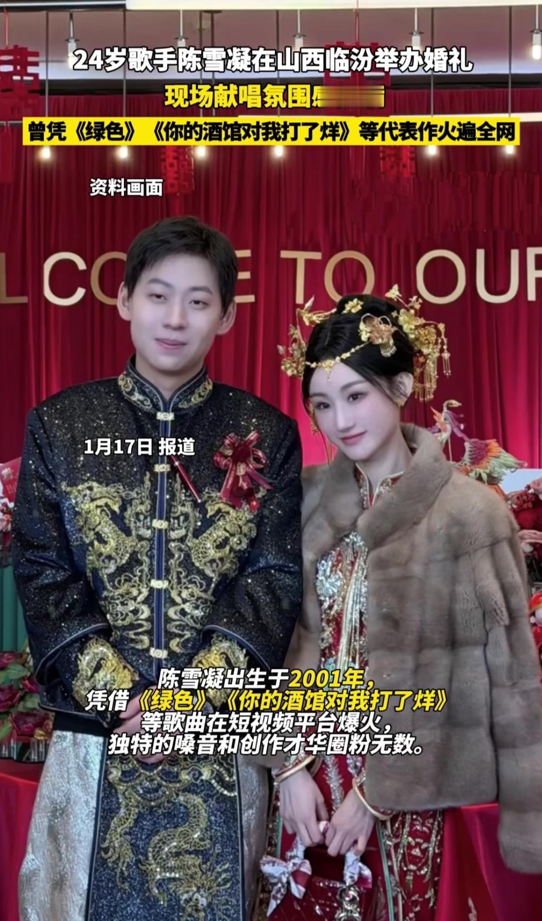 谁能想到啊,当年靠《绿色》《你的酒馆对我打了烊》唱哭全网的姑娘,今天穿婚纱在临汾办婚礼了!24岁的年纪,一头皇冠配婚纱,现场唱代表作的样子,浪漫得像把青春的旋律裹进了喜糖里。 去年11月刚官宣恋情,还因为删合照被猜分手,结果这波直接“杀疯了”——中式龙凤褂配西式婚纱,现场布置满了鲜花和金色装饰,连空气都裹着甜意。 当年循环她歌的人,有的还在单身,有的刚成家,看着她从唱“绿色”的少女变成新娘,突然觉得青春好像也跟着落了个温柔的结尾。你们当年有没有单曲循环过她的歌?