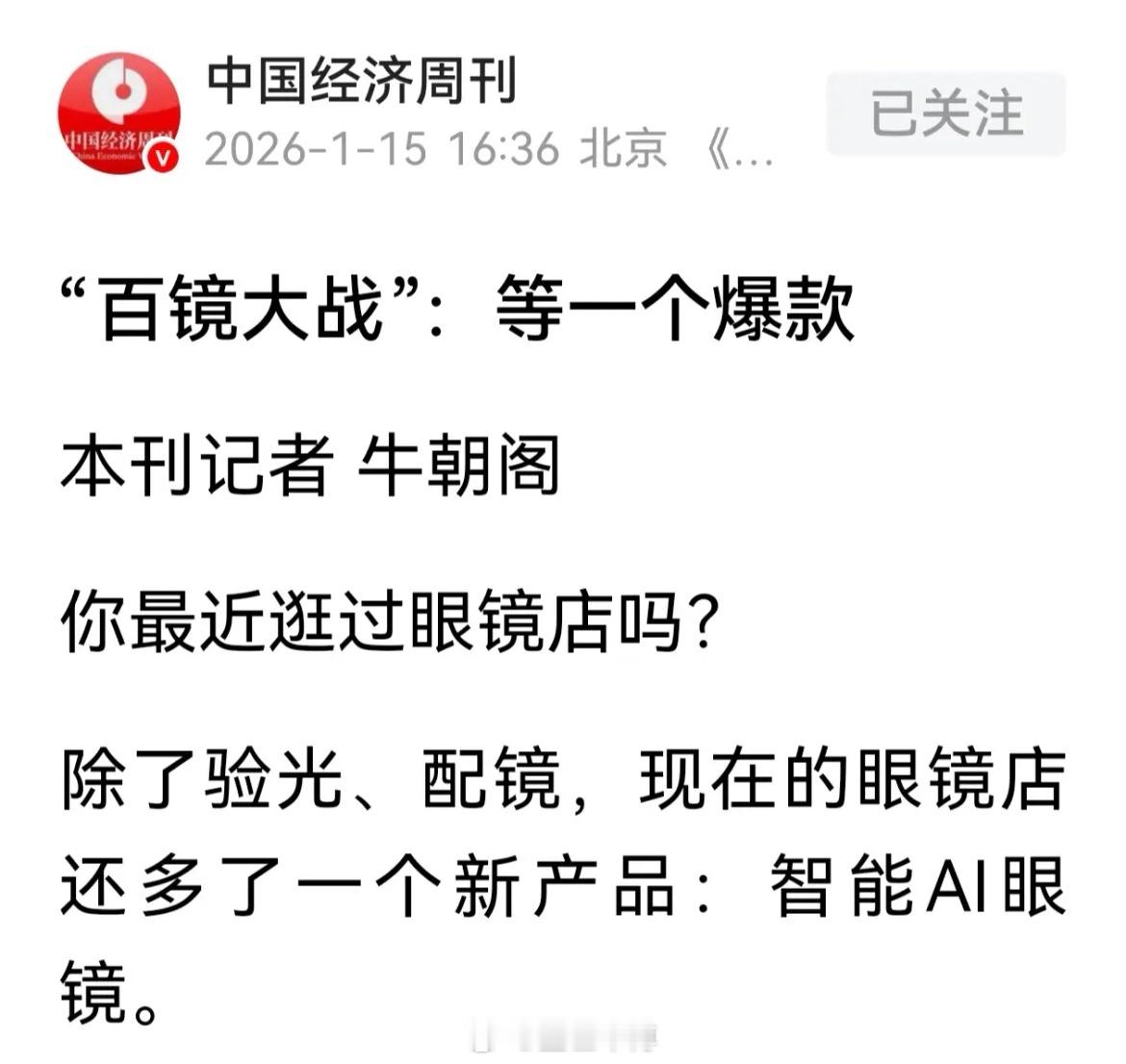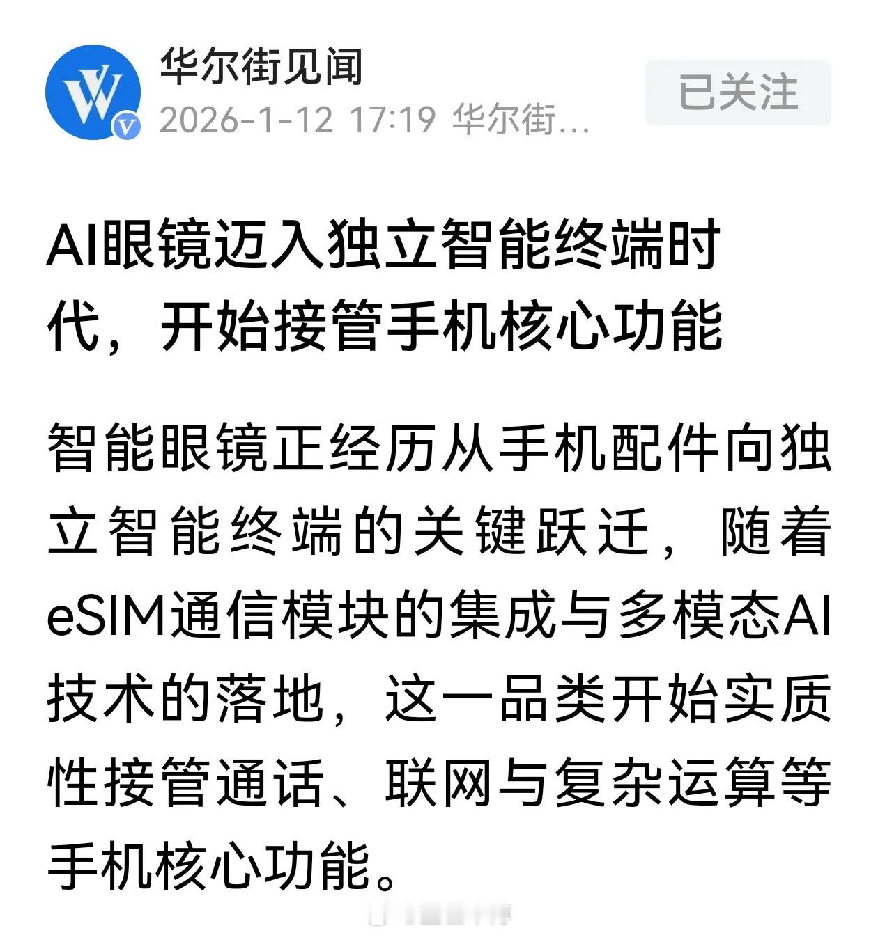 AI眼镜接管手机电话、联网等功能,“百镜大战”已经开启,AI眼镜会成为下一个热点吗?雷鸟创新在CES展会推出了首款支持eSIM的智能眼镜,可以直接打电话、实现AI对话、实时翻译和播放流媒体,也就是手机能做的智能眼镜也能做,智能眼镜不需要想以往那样,需要链接手机或WiFi才能工作,标志着智能眼镜完成了从手机关联产品到独立智能终端的蜕变。智能眼镜被广泛认为是“下一代智能终端”,也是物理AI的主要入口,这是因为智能眼镜具有天然的物理世界感知能力,数据与生态的协同价值突出。企业是不会放过这个机会的,纷纷下场开发自己的智能眼镜,仅仅在CES展会上,参展的中国智能眼镜厂商就有16家。有媒体形容为“百镜大战”并不为过,2025年底以来,百度、理想汽车、阿里、联想接连推出智能眼镜,加之早就下场的华为、小米、字节等老手,还有雷鸟、目影等新的垂类玩家。国外大厂Mate、谷歌、苹果、三星等也没闲着,这个市场真的是好不热闹。有机构预言2026年是智能眼镜元年,也有人会怀疑一个小众极客玩具是否会变成大众消费品?相信业界的眼光,这么多企业包括科技大厂都发力智能眼镜,那这个市场离爆发期就不远了。据艾媒咨询显示,2025年智能眼镜销量激增1344.8万副,同比增长350.82%,到2029年有望突破1.3亿副。这确实是一个可能的消费大市场,但资本市场反映较为平淡,无论是产业链前端的光学显示模组、主控SOC芯片、感知与音频系统、电池与电源管理系统,还是中端的整机集成以及ODM/OEM代工,后端的应用领域都没有给出预期估值。等一个爆款产品或者触发事件出现,或许智能眼镜就是热点了。
