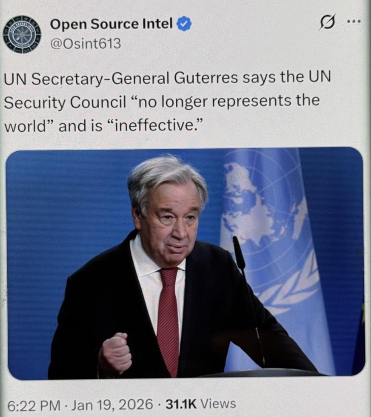 快讯!联合国秘书长古特雷斯表示,联合国安理会 “已不再代表世界”,并且是 “无效的”。 古特雷斯这话戳破的不是联合国的面子,而是冷战结束三十年来国际秩序的底子。当安理会五个常任理事国在乌克兰、巴以问题上四次动用否决权,当全球 193 个国家的诉求被五张票卡住,这个诞生于二战废墟、本应 “大国一致” 维护和平的机制,确实成了大国博弈的擂台。 安理会这毛病,根源得从 1945 年说起。那时候二战刚打完,51 个国家凑一起搭起联合国的架子,五常和否决权的设置,本来是想让大国抱团防着世界大战再爆发。 可七十多年过去,世界早不是当年的模样了,全球人口从 25 亿涨到 80 亿,国家数量翻了三倍还多,非洲、拉美一堆新兴国家冒出来,可安理会的座位和规矩几乎没变。 古特雷斯说得直接,“1945 年的解决方案解决不了 2026 年的问题”,这话跟戳破窗户纸一样,把藏着的问题摆到了明面上。 否决权本来是 “大国一致” 的保险栓,现在倒成了个别国家的 “挡箭牌”。 从 1947 年到 2024 年,安理会有 255 个议题被一票否决,中东问题就占了 33.3%,其中巴勒斯坦相关议题最多。 巴以冲突爆发后,安理会前前后后开了 14 次会表决停火,10 份草案没通过,美国一个人就否了 8 次,有好几次还是 14 票赞成就它一票反对。 2025 年 9 月那次更典型,安理会开第 10000 次会议这么关键的场合,10 个非常任理事国联合提的停火案,照样被美国一票否掉,加沙的人道主义援助就这么卡着进不去。 大国博弈把安理会变成了 “角斗场”,中小国家只能当观众。 按规矩,安理会 15 个席位里,非常任理事国占 10 个,可实质性决策必须五常全同意才行。 2025 年 2 月俄乌冲突三周年,安理会终于通过了个和解决议,中美俄都投了赞成票,这反倒成了稀罕事,因为之前全是分歧。 发展中国家占了联合国的大多数,可在安理会里说话没分量,非洲、拉美连个常任席位都没有,他们关心的粮食安全、气候变化议题,常常因为大国没兴趣就被搁置。 王毅外长去年主持安理会会议时就说,得提升全球南方的代表性,不然治理体系根本不公正。 大家不是没喊过改革,可喊了几十年还是原地打转。 问题的根子在权力分配,五常手里的否决权是块肥肉,谁都不想松手。 美国和俄罗斯用否决权最多,一个 93 次一个 147 次,冷战时美苏对着否,现在换成在地区冲突里各自护着自己的利益。 英国的 32 次否决里有 23 次都跟着美国走,法国 17 次里也只有 4 次是独立投的,大国抱团更让中小国家的诉求没地方放。 古特雷斯想让安理会扩大成员、改决策机制,可每次一提,要么被大国拖着,要么中小国家在具体方案上吵起来,根本达不成共识。 联合国的作用其实没人否认,这是最具权威性的国际组织,作用只能加强不能削弱。 可作用要发挥得出来才行,现在的安理会连大部分停火决议都推不动,还怎么维护和平?2025 年 6 月那回,中法俄英全赞成停火,就美国反对,结果加沙的战火又烧了好久。 这种场景多了,各国对安理会的信任度只会越来越低,有些国家甚至开始绕开安理会搞小圈子,多边主义的根基都跟着晃。 古特雷斯的批评更像个警钟,不是要拆联合国的台,是想逼着大家解决问题。 1945 年的架构撑不起现在的世界,这是明摆着的事实。 193 个国家的意愿不能总被“五张票中的某一张”卡住,全球南方的声音也不能总被无视。
