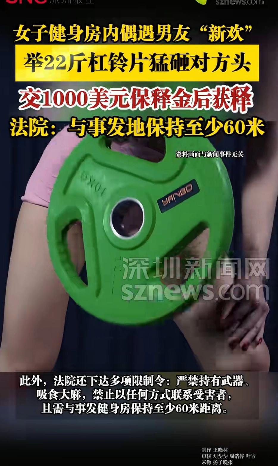 女子健身房偶遇男友“新欢”,举22斤杠铃片猛砸对方头。 法院:离事发地保持至少6
