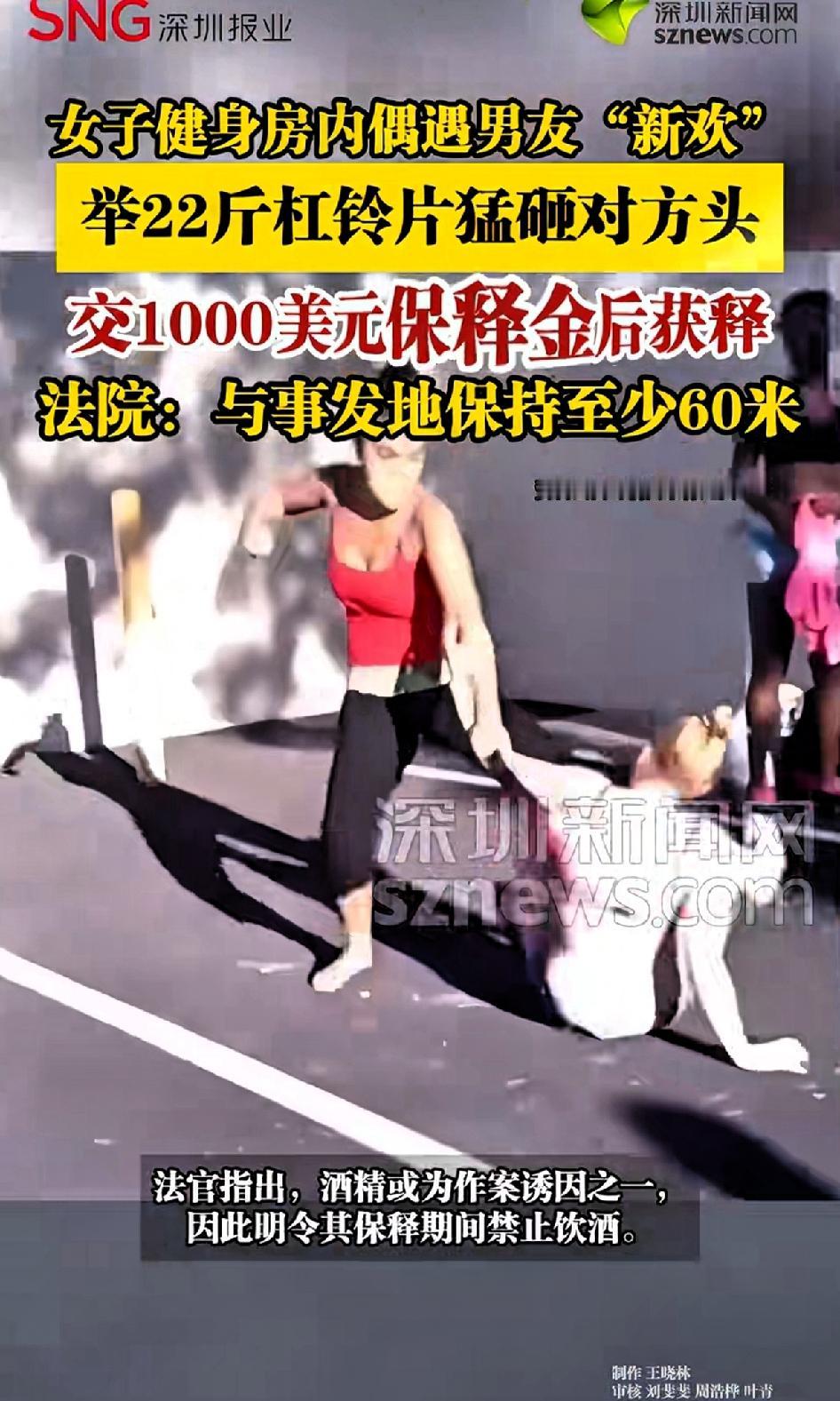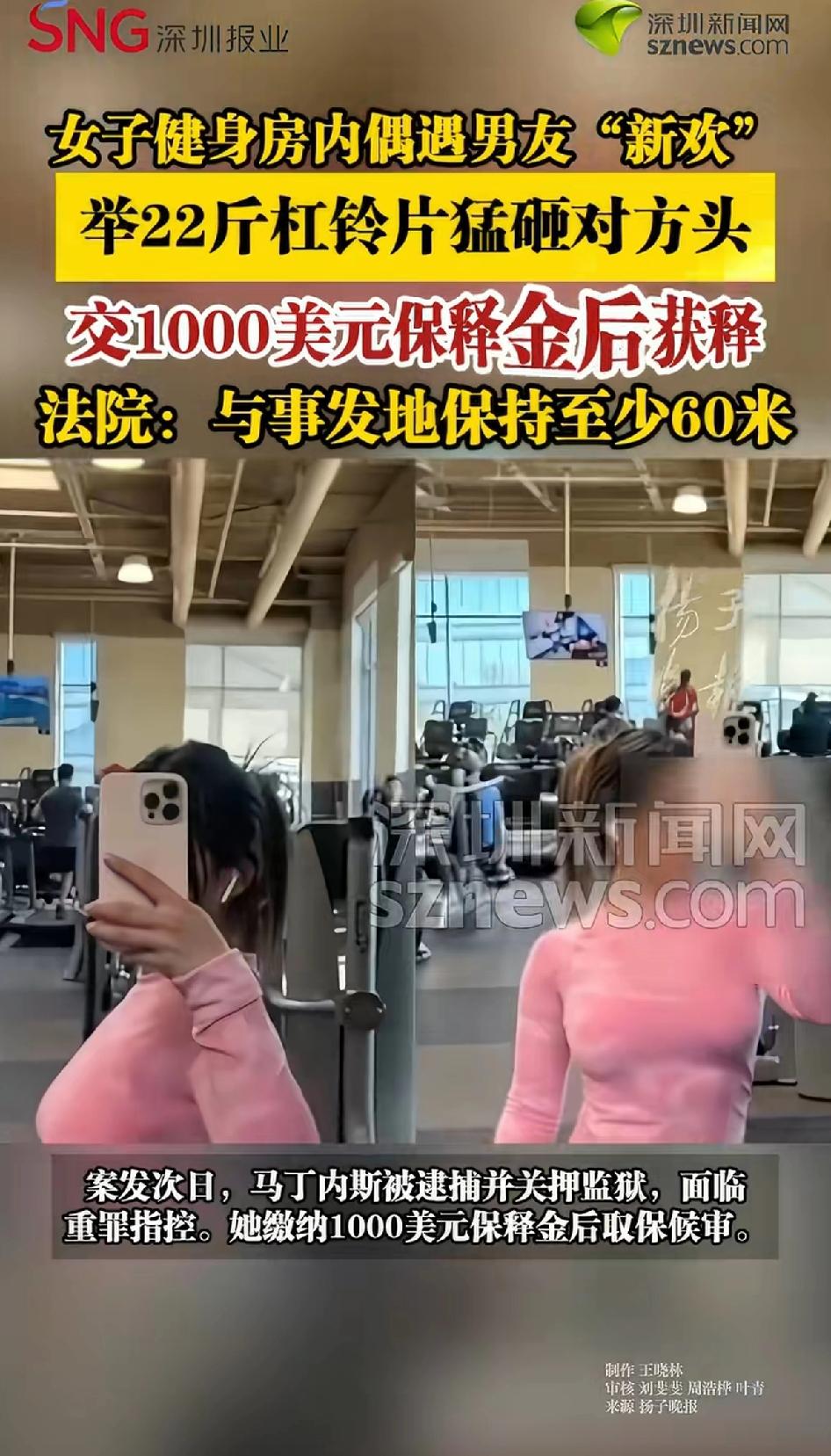 女子健身房偶遇男友“新欢”,举22斤杠铃片猛砸对方头。 法院:离事发地保持至少60米。 1月7日,美国得克萨斯州一健身房上演了“全武行”。24岁的阿拉林·马丁内斯偶遇男友“新欢”辛迪·阿吉拉尔,两人言语交锋后,马丁内斯情绪失控。她冲向器械区,抄起22斤重的杠铃片就砸向阿吉拉尔脑袋,沉闷撞击声让健身氛围瞬间混乱。 真是个自由的国度,女性碰到情敌都这么勇猛,能不动手绝不啰嗦。上去就想干死对方。 马丁内斯袭击前还叫嚣着要砸死对方,好在未造成致命后果。案发次日她被逮捕,面临重罪指控,交1000美元保释金后取保候审。法官指出酒精可能是诱因,保释期她不能饮酒等。1月22日她将再次出庭,冲动是魔鬼,这暴力行为代价可真不小。 为了渣男不值得,应该俩人合伙揍渣男,不应该互殴。