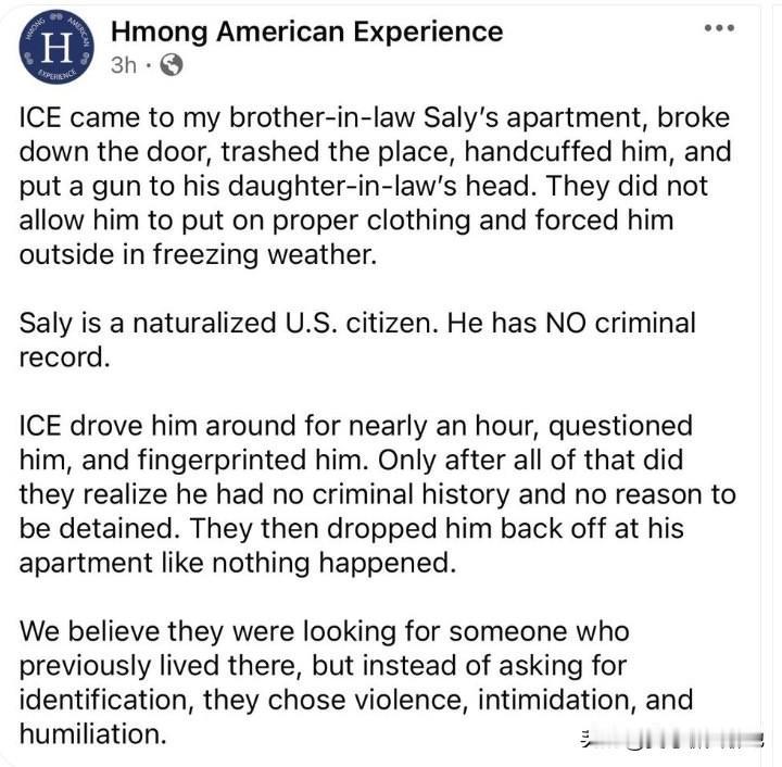 这位苗族老人在10度下被带离家里,不准穿衣服。 美国海关与移民执法局够狠,破门而入,用枪顶着他的头,把这位苗族人拖出家门,抓走。 搞了半天,最后发现,这位老人是美国公民,没有犯罪记录。 60年前中情局利用苗族人对抗越南,并承诺他们公民权和土地。后来,美军撤出越南,很多苗族人移居美国。 美国苗族多为东南亚赫蒙人后裔,跟咱中国的苗族没啥关系。越战时期助美作战,老挝政权更迭后遭清算,十余万人逃至泰国难民营,后以难民身份迁入美国,现约36万,聚居加州、明尼苏达等州。