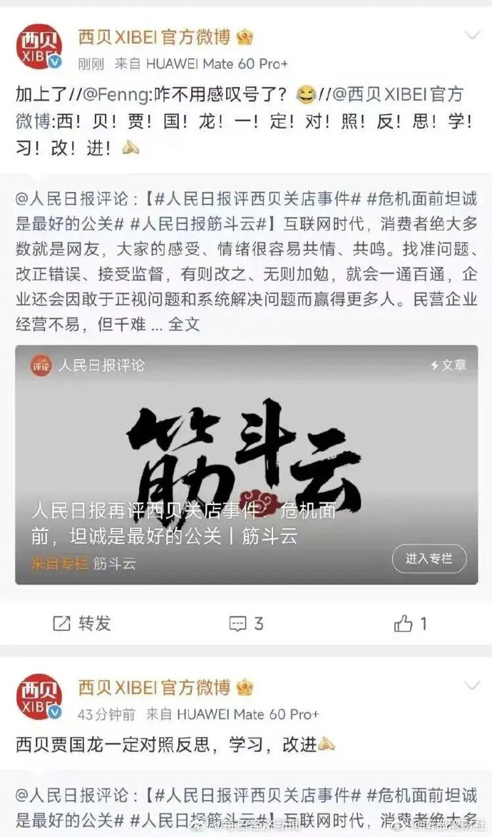 #西贝再度回应加了15个感叹号#【#西贝回应人民日报评论加了15个感叹号#:贾国龙一定对照反思,学习,改进】#西贝称贾国龙一定对照反思# 罗永浩与西贝创始人贾国龙的微博账号被禁言后,人民日报两度就西贝关店事件发布评论文章。1月19日,人民日报发布评论文章《危机面前,坦诚是最好的公关》。文章指出,互联网时代,消费者绝大多数就是网友,大家的感受、情绪很容易共情、共鸣。找准问题、改正错误、接受监督,有则改之、无则加勉,就会一通百通,企业还会因敢于正视问题和系统解决问题而赢得更多人。民营企业经营不易,但千难万难,赢得网络时代的消费者认可就不难。相信贾国龙们能够转换思维、提升本领,为企业赢得新的发展机会,和消费者一道为我国经济发展增续不竭动力。随后,转发评论文章,称“西贝贾国龙一定对照反思,学习,改进”。当有网友询问为何不在结尾加感叹号后,西贝官微再次更新,并在上述语句每个字后都加上感叹号。